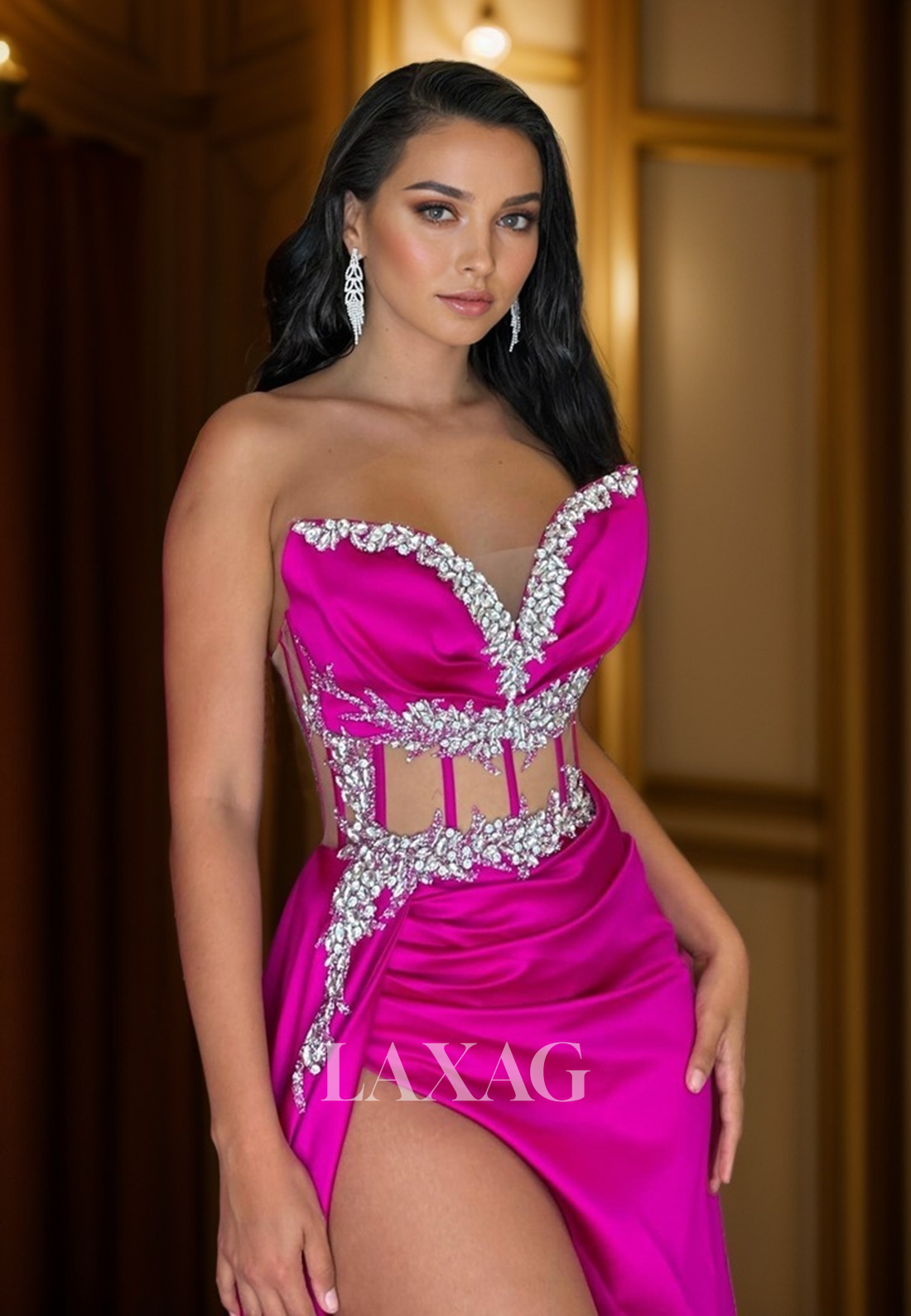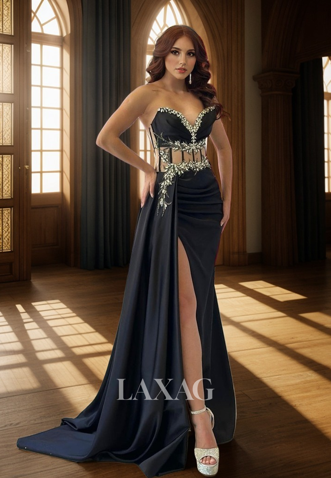 22093 - Sexy V neck Satin Pleated Beads High Split Mermaid Formal Prom Dress
