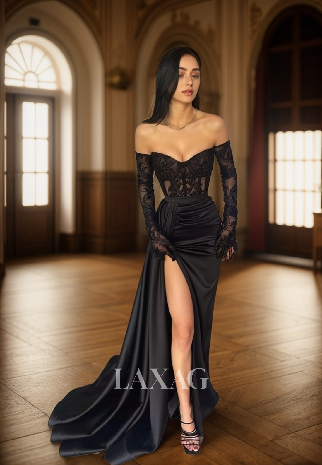 Sexy V-Neck Long Sleeves Lace Appliques High Slit Prom Dress with Train