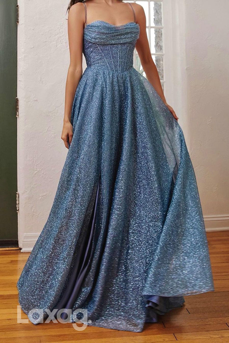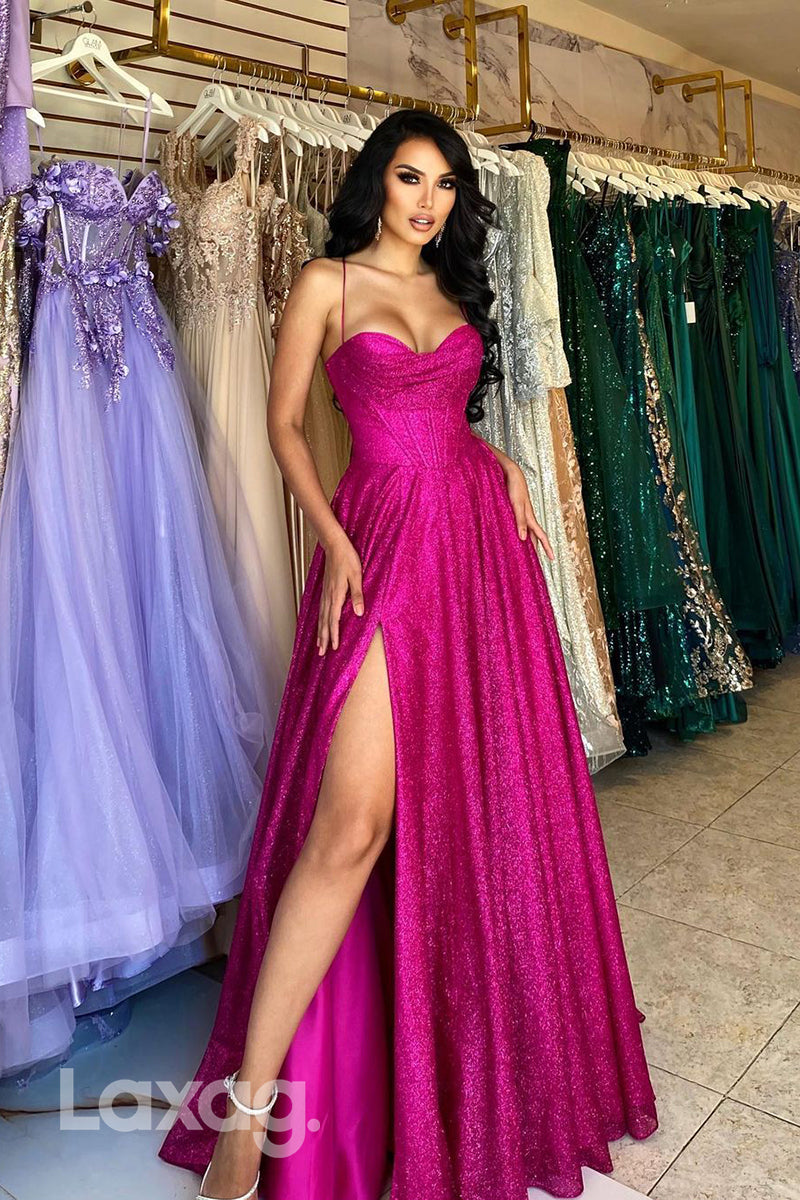 A-Line Spaghetti Straps Fully Sequins Party Prom Formal Evening Dress with Slit