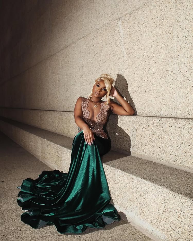 Feel confident and beautiful in our Deep V-Neck Off-Shoulder Straps Beaded Sweep Train Mermaid Prom Dress! The deep v-neckline and off-shoulder straps add a touch of elegance, while the beaded detailing and sweep train create a stunning silhouette. Perfect for Black girls looking to slay their prom night!