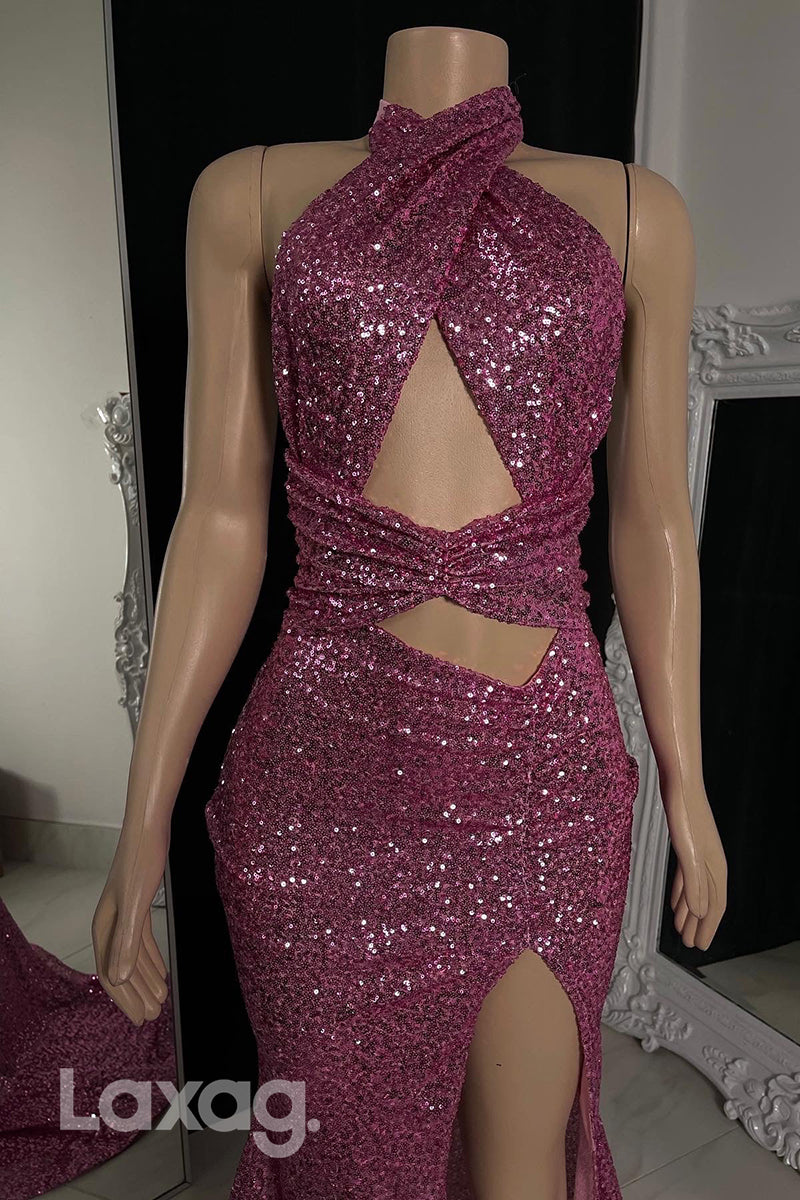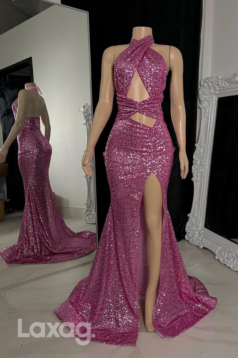 22472 - Halter Backless Fully Sequins High Slit Mermaid Prom Dresses for Black Girl Slay