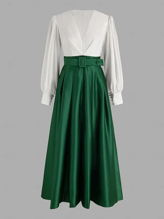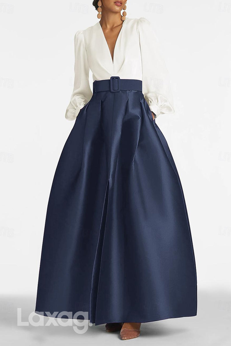 Expertly crafted for the mother of the bride, this A-Line dress boasts a flattering V-neck, empire waist and long sleeves. The stunning design is enhanced with a delicate belt, creating a timeless and elegant look for any wedding. Embrace sophistication and grace with this exquisite dress.