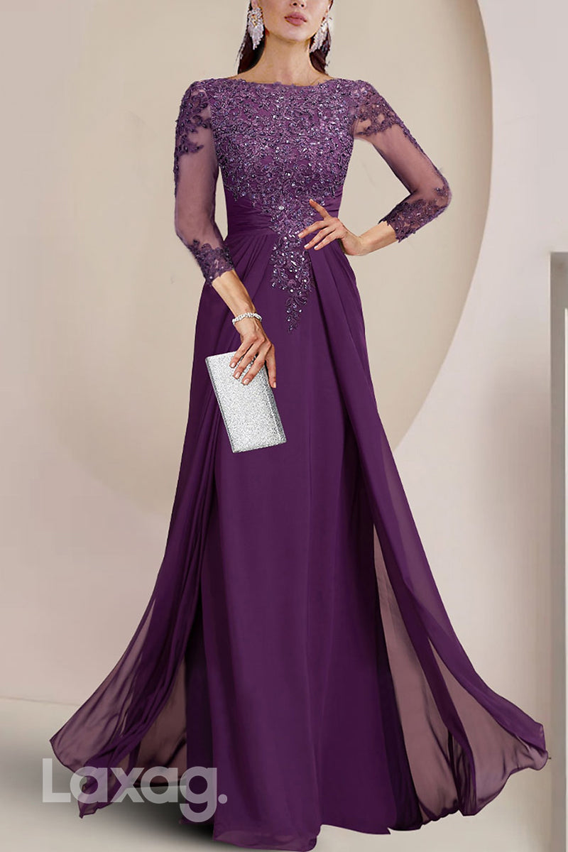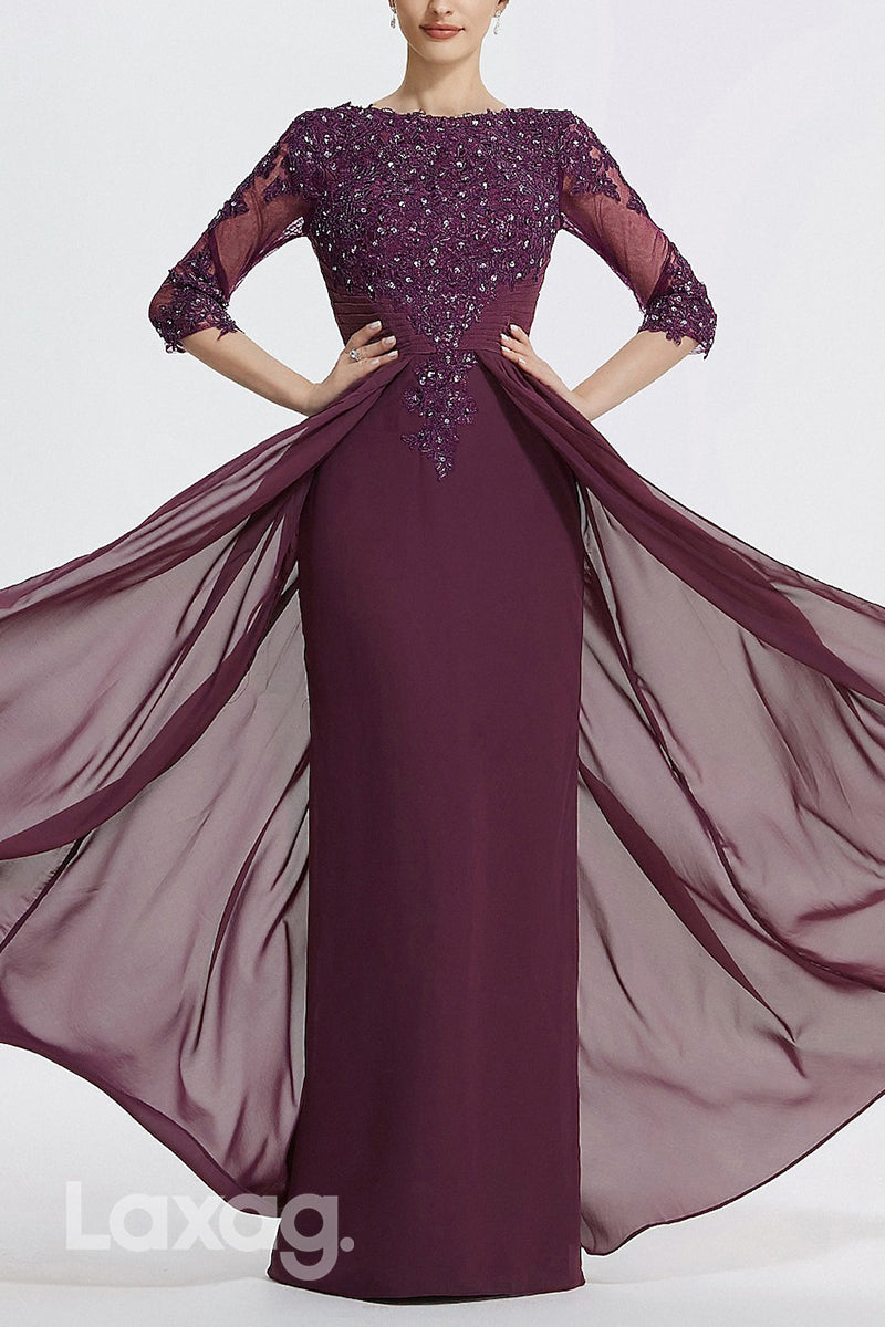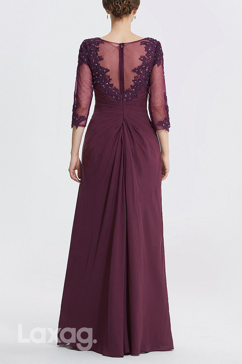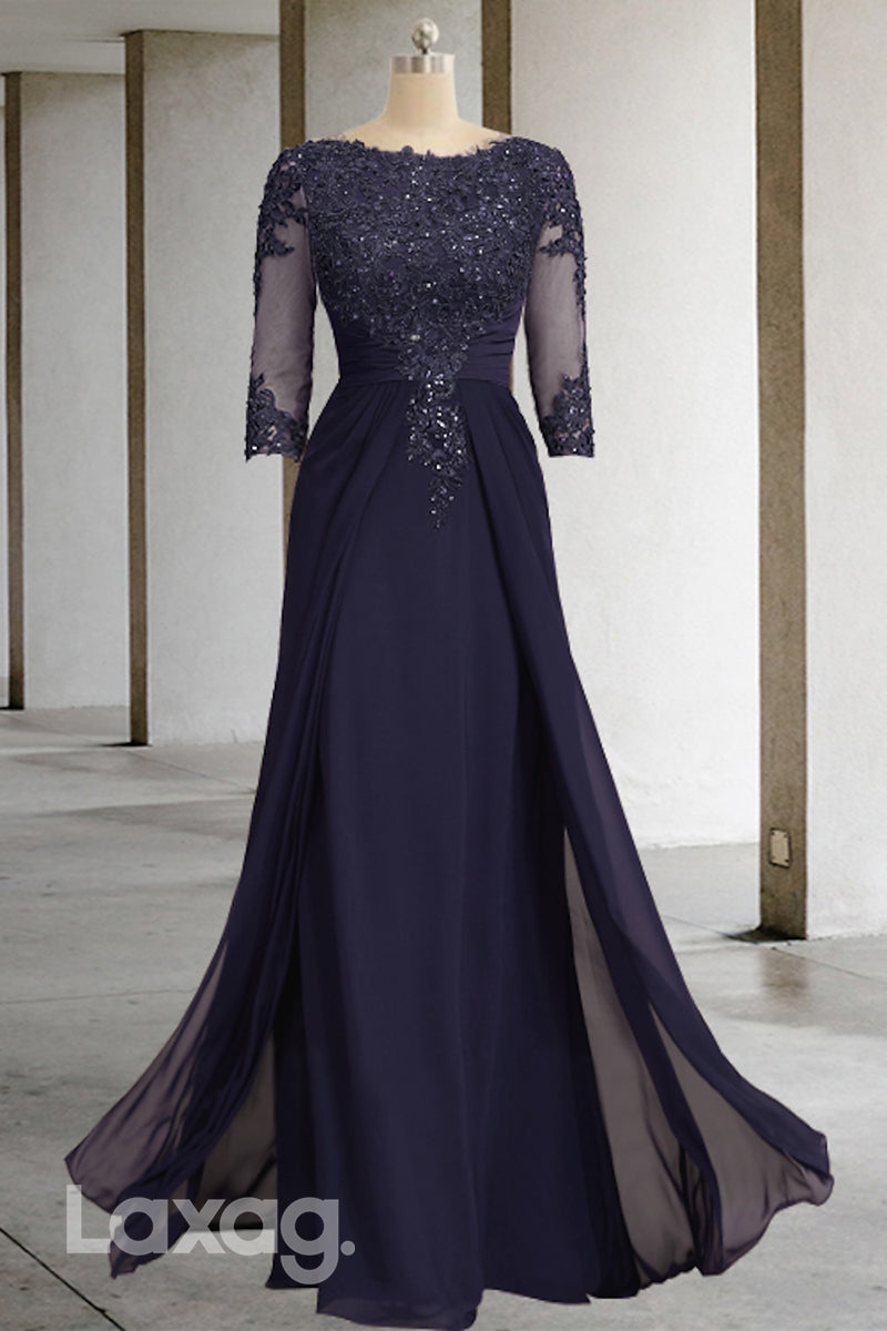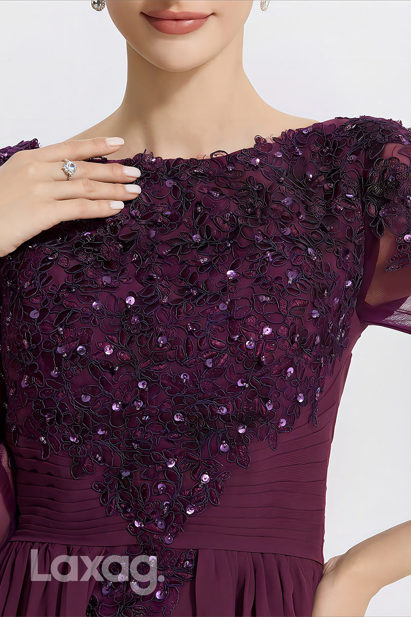 22521 - A-Line Round Quarter Sleeves Appliques Chiffon Mother of the Bride Dress