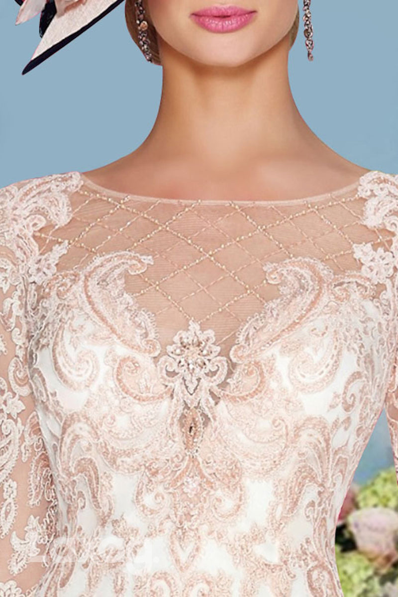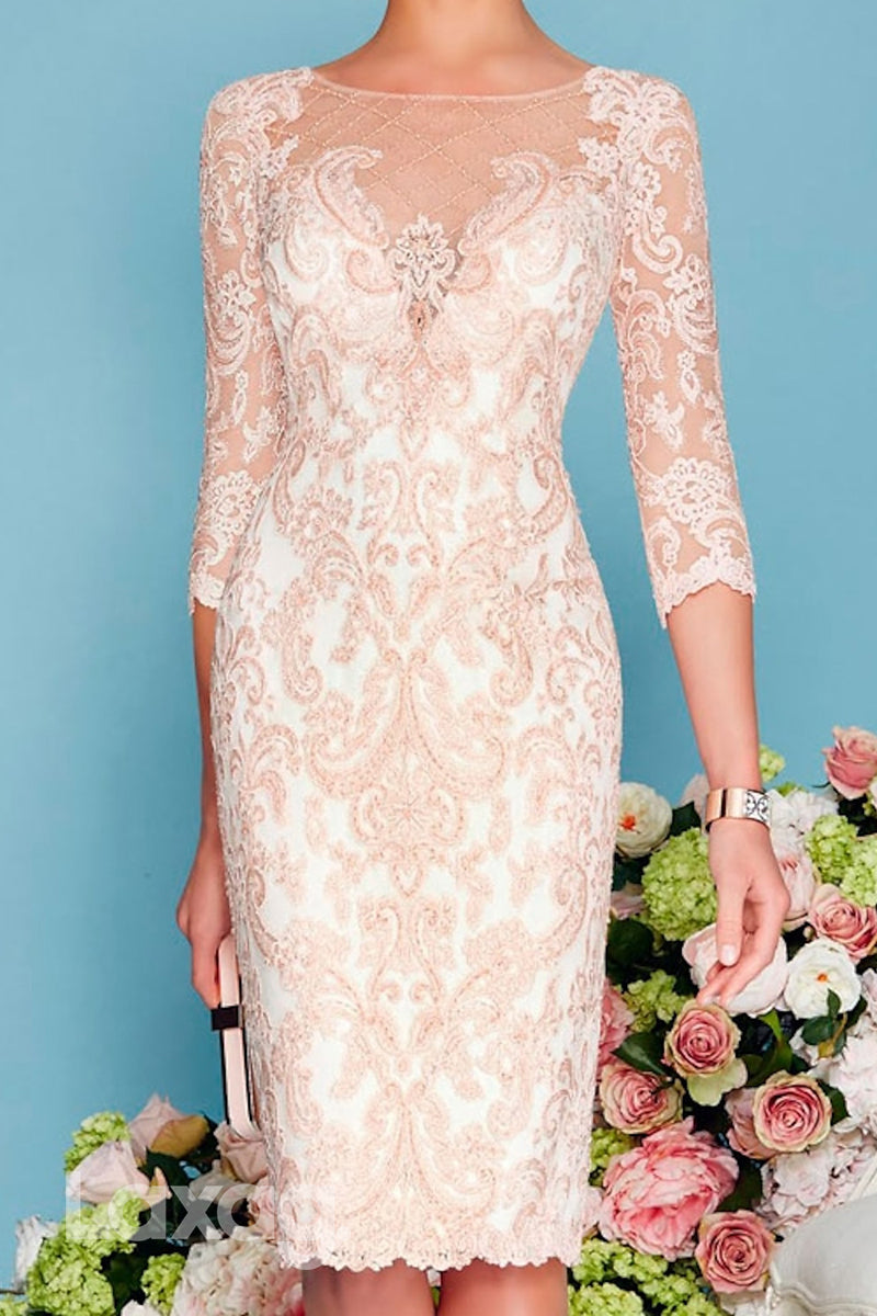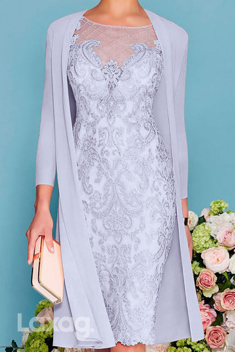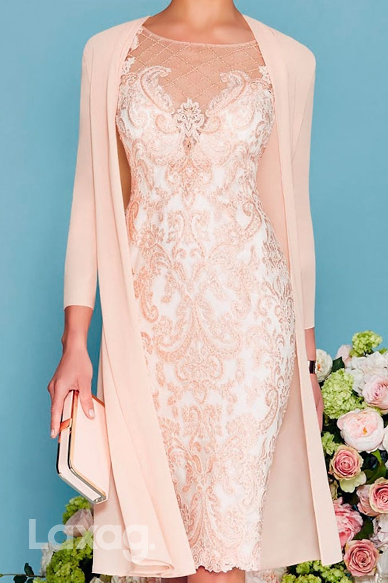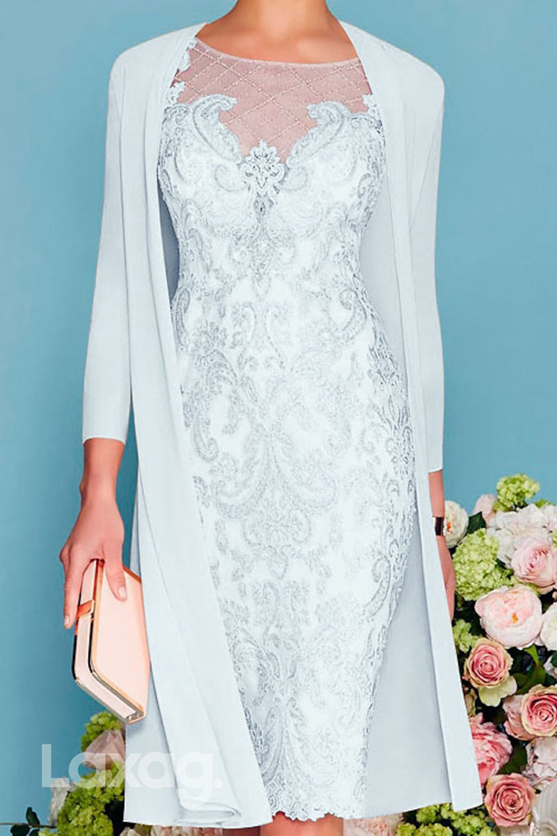 This elegant two-piece suit dress boasts delicate appliques and flowing chiffon, perfect for the mother of the bride. The sophisticated design exudes sophistication and pairs well with any wedding aesthetic. Stay comfortable and stylish while celebrating your loved one's special day.