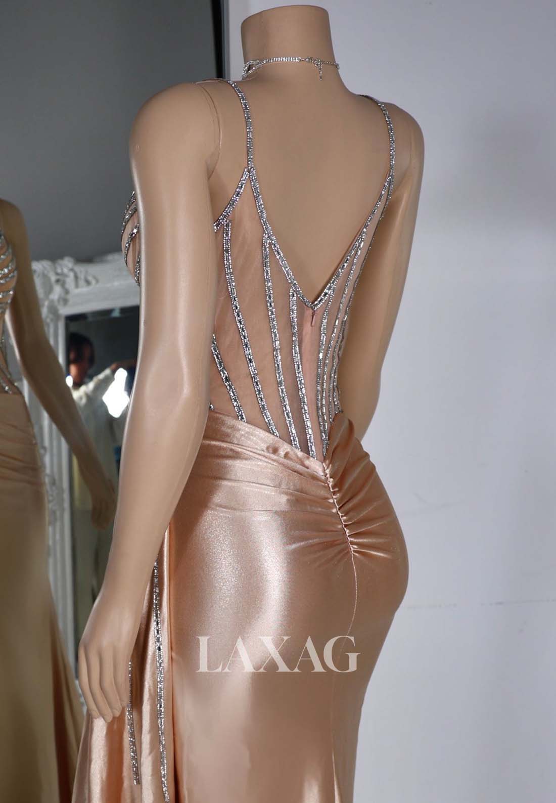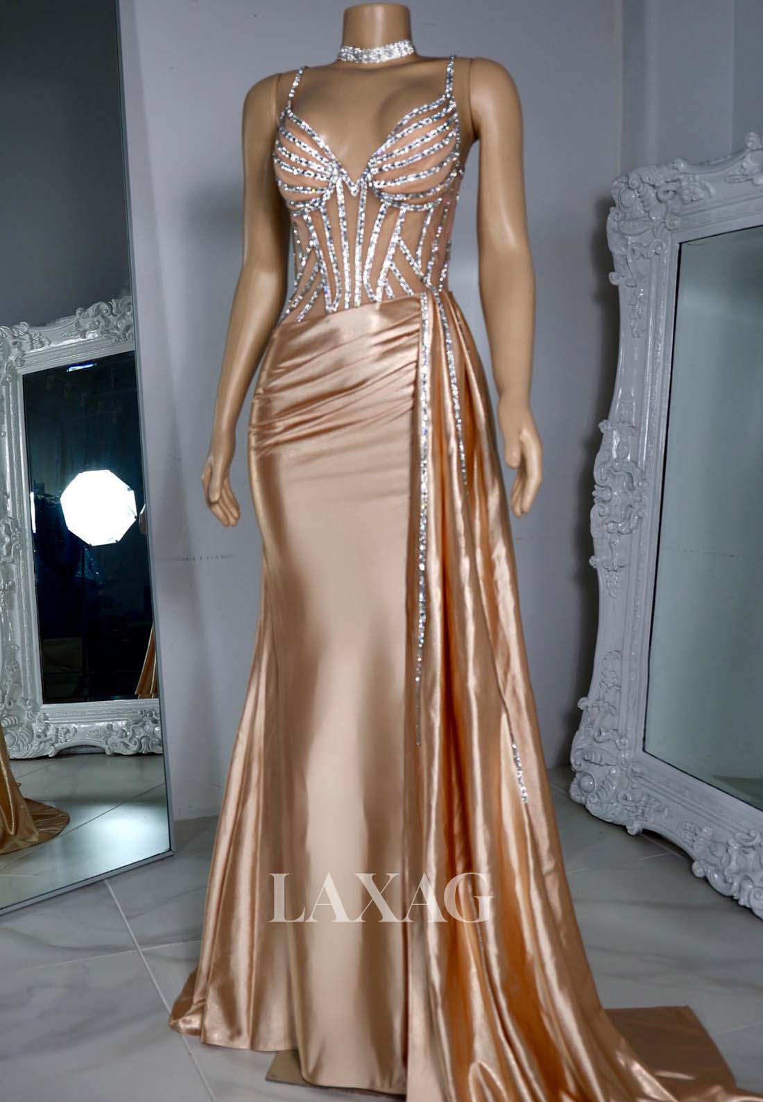 Spaghetti Straps Beaded Mermaid Prom Dress Off-Shoulder Sleeveless Pleated Formal Gowns with Train