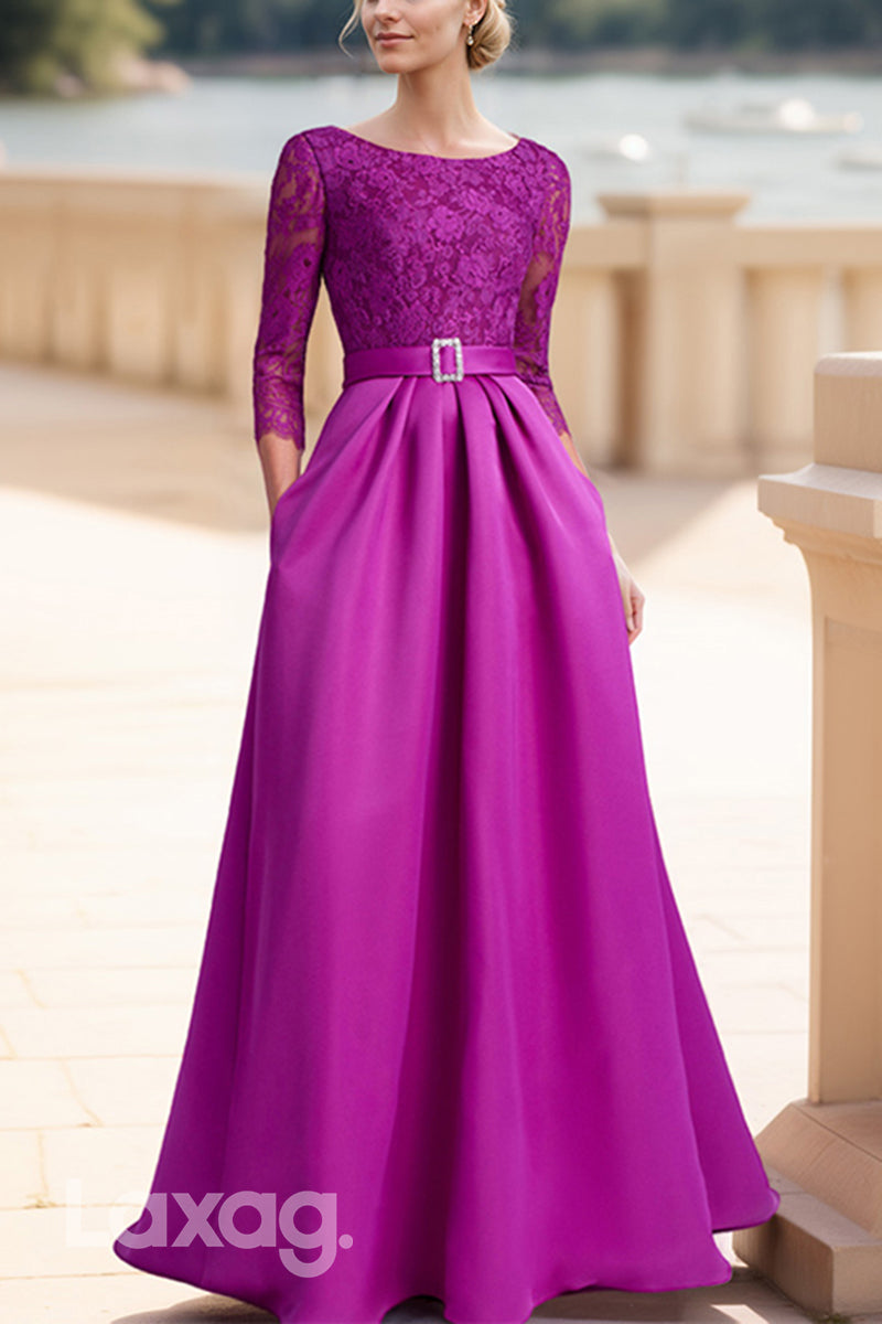 A-Line Round Quarter Sleeves Appliques Beaded Belt Mother of the Bride Dress