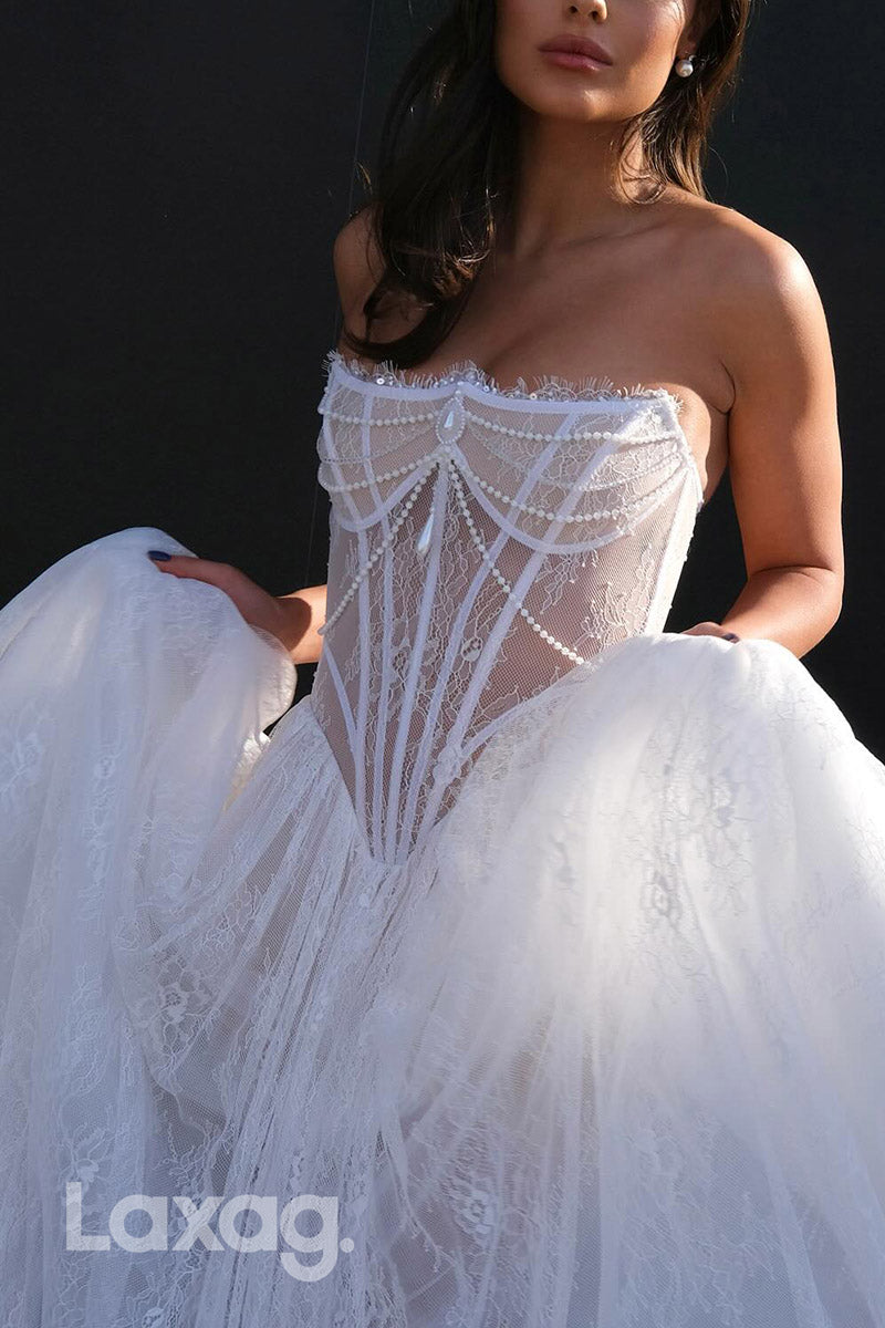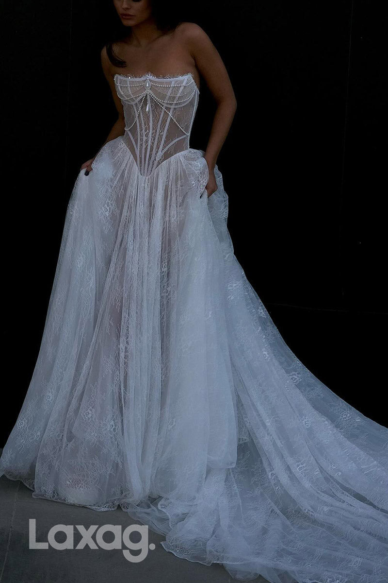 A-Line Sweetheart Sleeveless Sequined Beaded Pleated Tulle&Lace Wedding Dress with Train