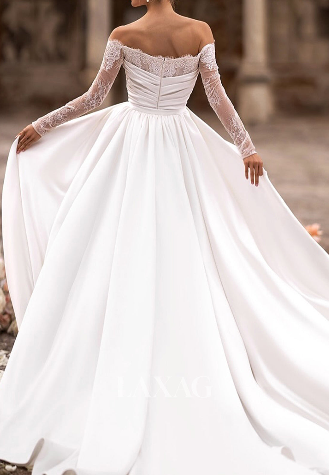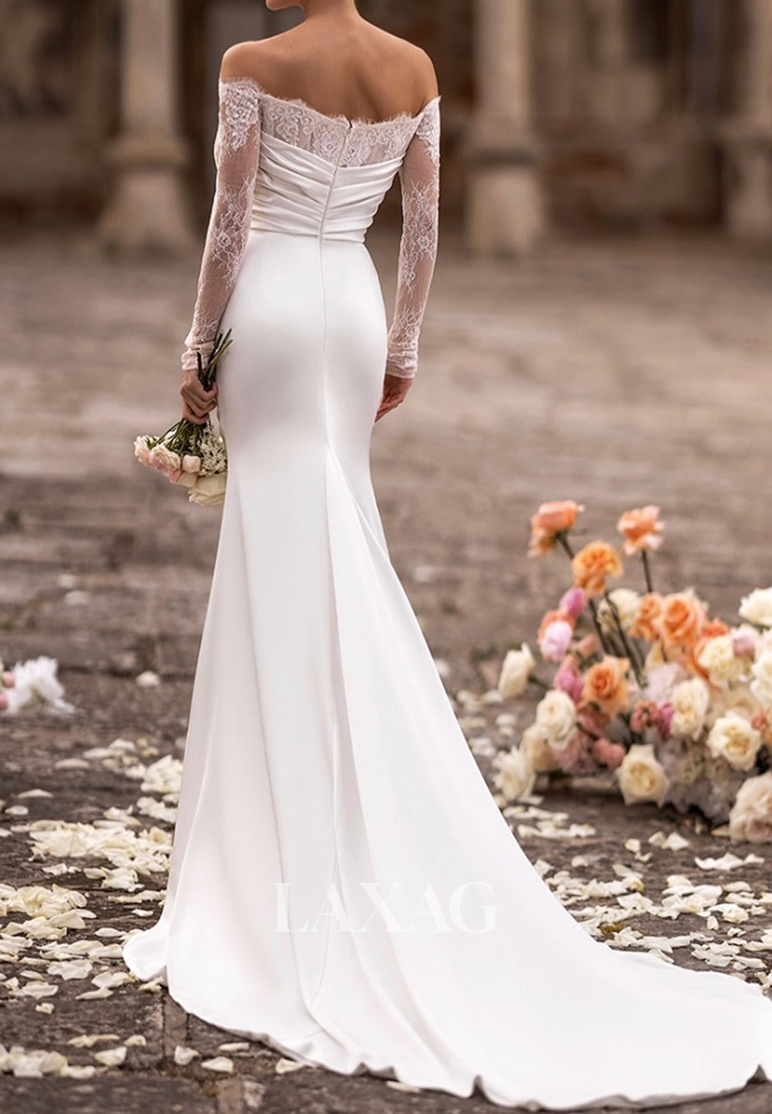 Off-Shoulder Lace Long-Sleeves Bride Gowns Sleek Satin Mermaid Wedding Dress with Train