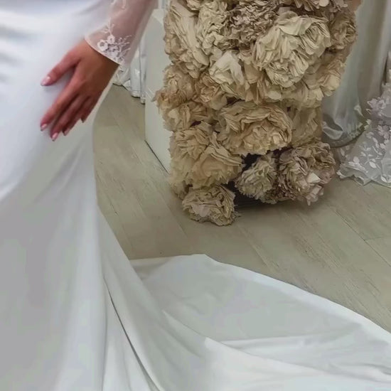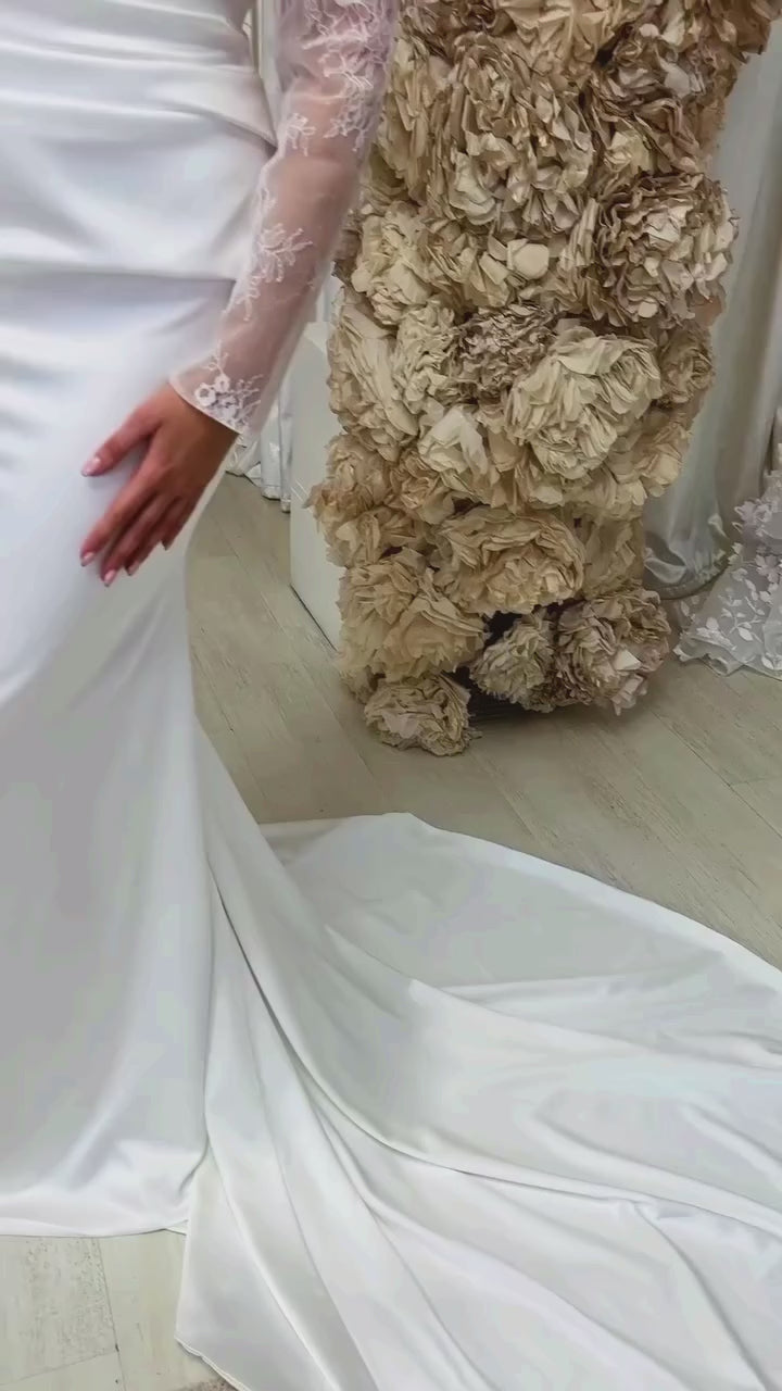 This sleek satin mermaid wedding dress features an off-shoulder lace long-sleeve top and a dramatic train. The elegant design is perfect for any bride looking to make a statement on her special day. This dress is both stylish and comfortable, making it the perfect choice for a modern and sophisticated wedding.