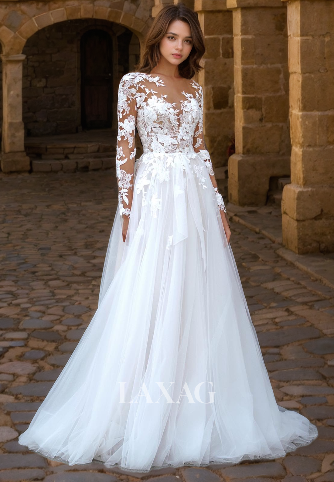 A-Line Long Sleeves Tulle Lace Elegant Wedding Dress with Train