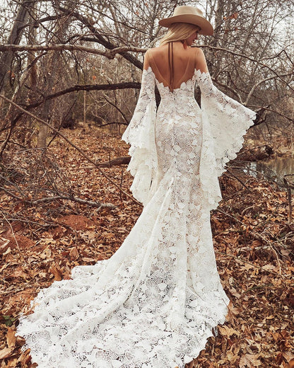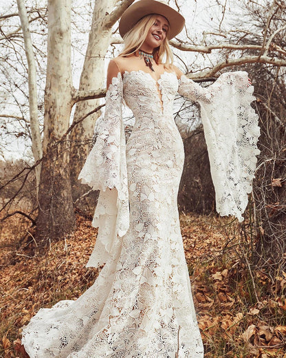 Off Shoulder Long Sleeves Tulle Lace Elegant Wedding Dress with Train