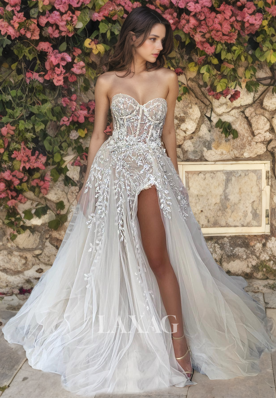 This wedding dress features a classic A-line silhouette, complemented by a strapless neckline, delicate appliques, and a tulle fabric adorned with high quality appliques. The high slit adds a touch of modernity and sophistication, while the train provides a traditional wedding look.