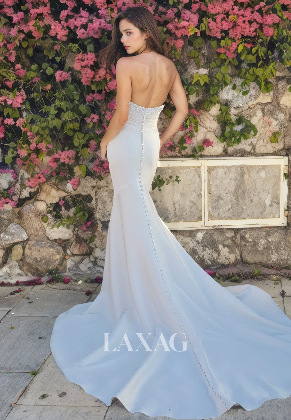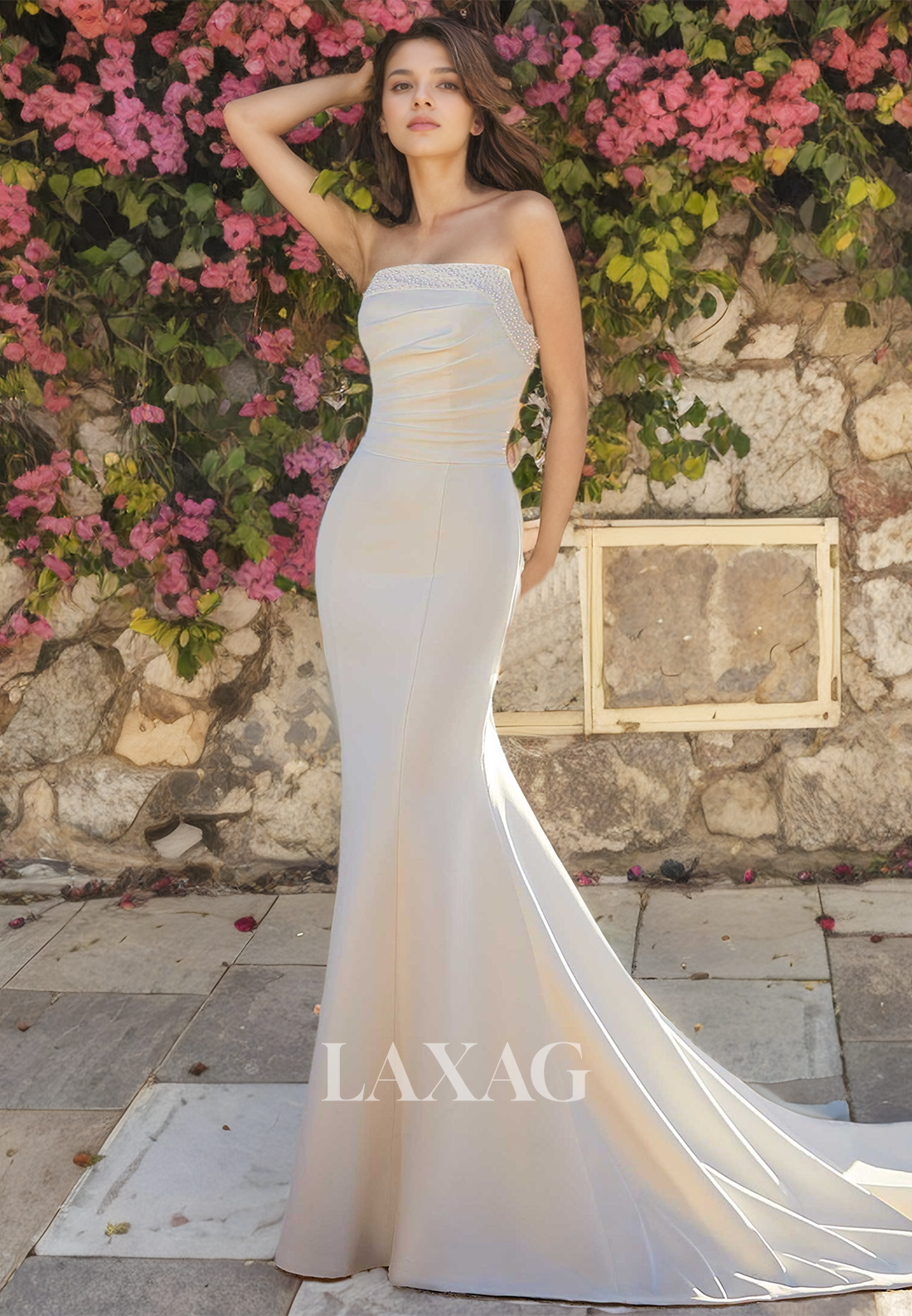 Strapless Pearls Sleek Satin Mermaid Wedding Dress with Train