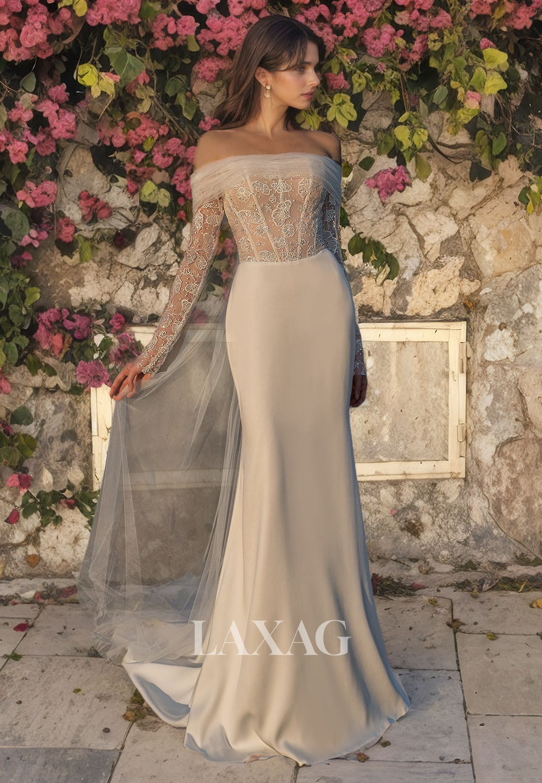 This stunning off-shoulder wedding dress is adorned with intricate sequin appliques, adding just the right amount of sparkle. The long sleeves and train add an elegant touch to this tulle gown. Perfect for the trendy and romantic bride.