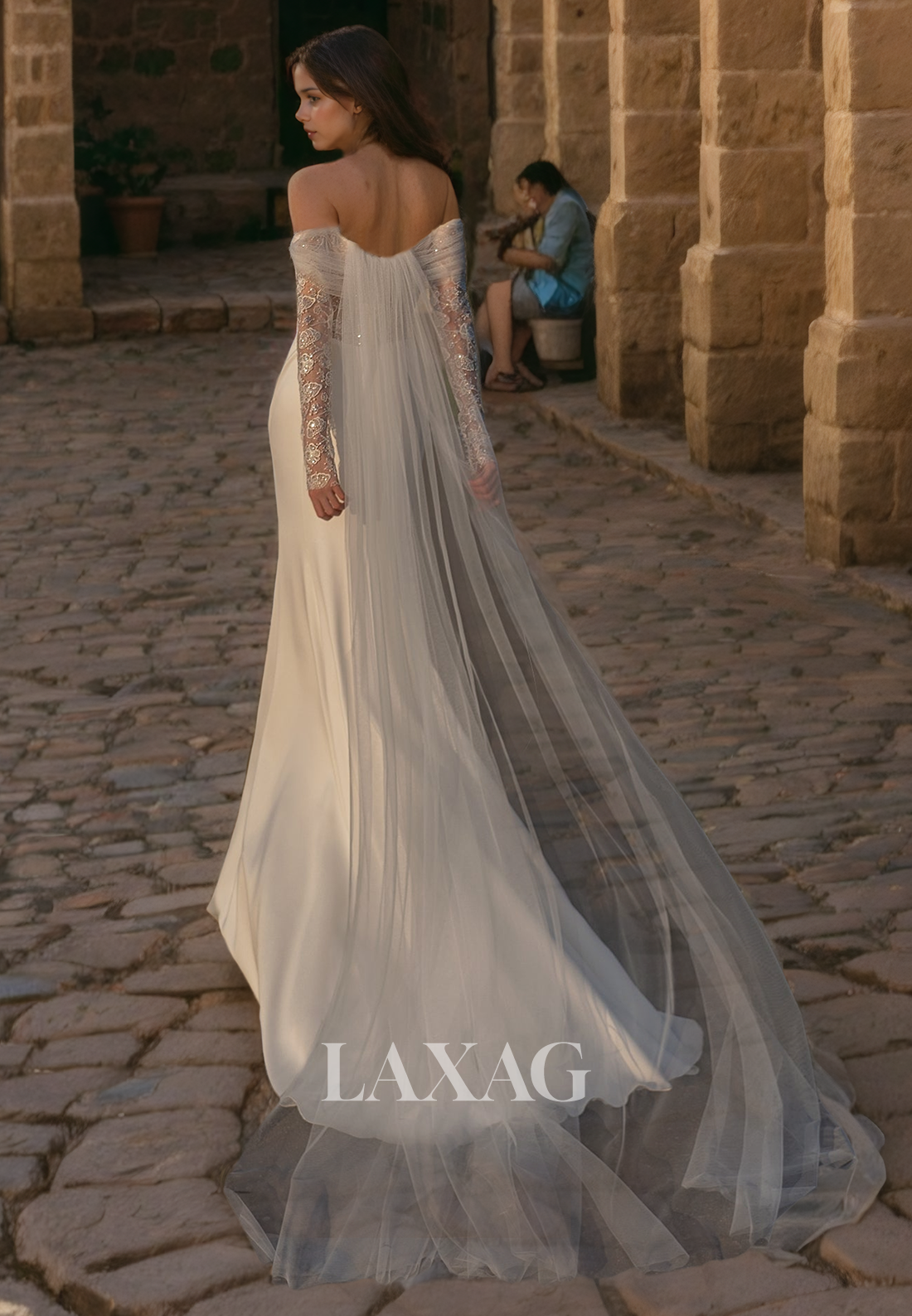 Off Shoulder Long Sleeves Sequins Appliques Tulle Wedding Dress with Train