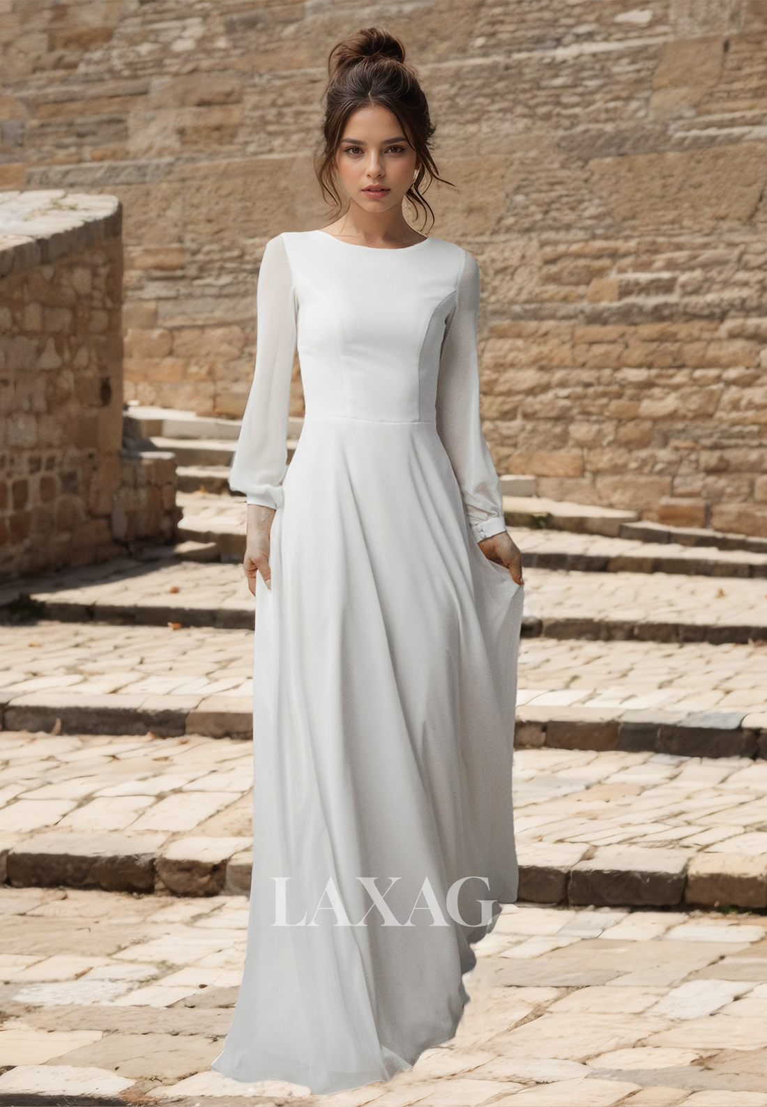 This High Scoop-Neck Long-Sleeves Fitted Bride Gowns Satin Sweep Train Wedding Dress is the perfect blend of elegance and comfort. Crafted from luxurious satin, this dress features a high scoop-neck and long sleeves for a timeless look. The fitted silhouette and sweep train add to its sophisticated appeal, making it the ideal choice for any bride.