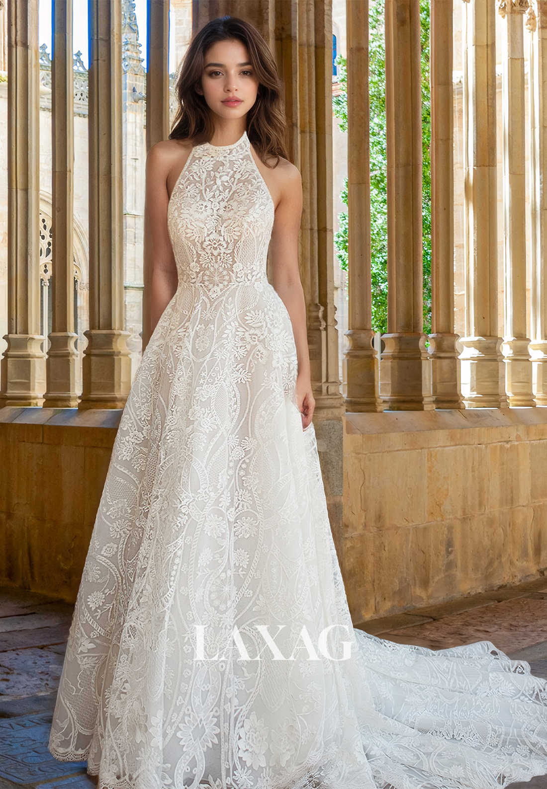 Halter Scoop-Neck Off-Shoulder Sleeveless Pleated A-Line Wedding Dress Allover Lace Sweep Train Bride Gowns