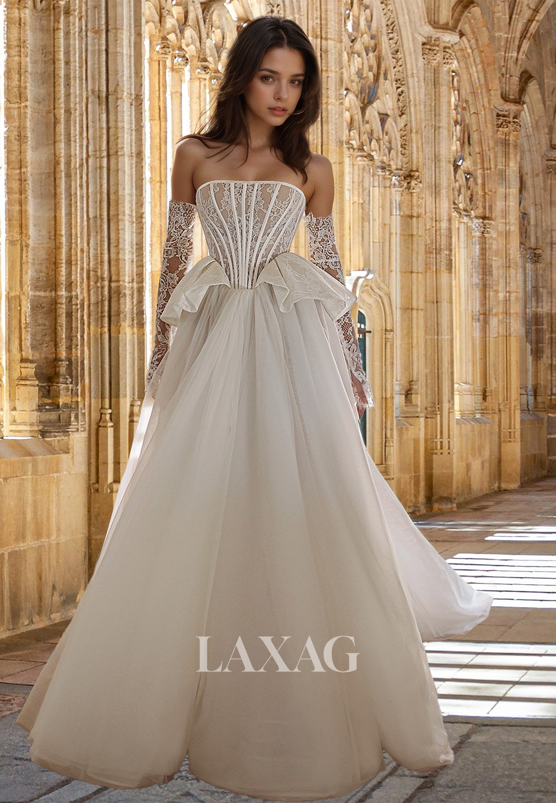 Tube Top Lace Long-Sleeves A-Line Wedding Dress Pleated Applique Tulle Bride Gowns with Train
