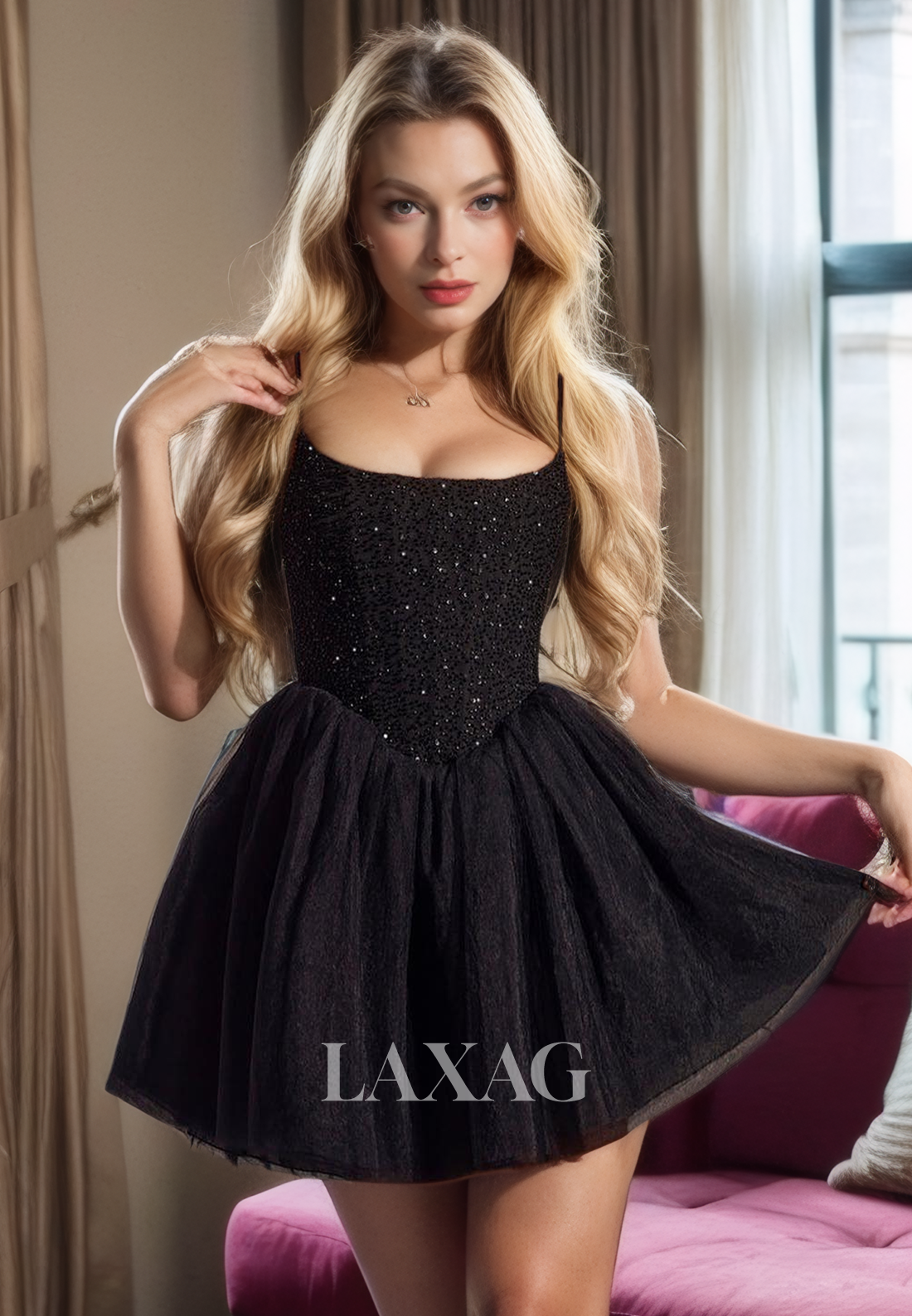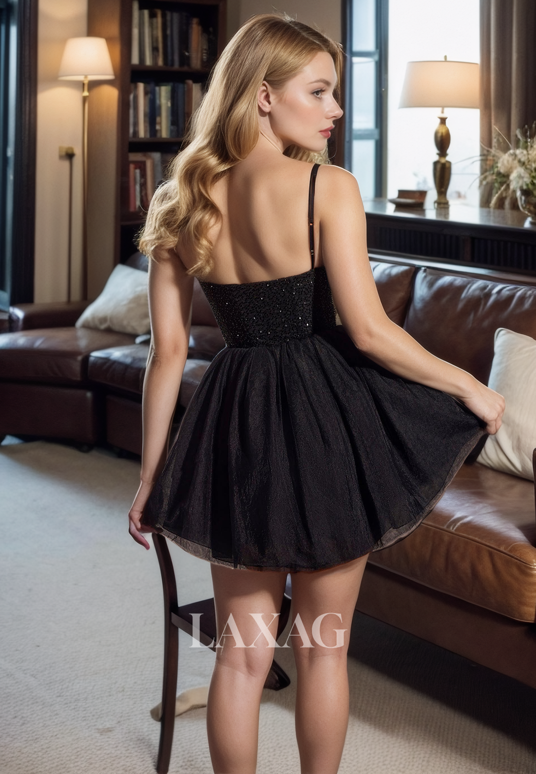 A-Line Spaghetti Straps Sequins Tulle Sleek Satin Party Homecoming Dress