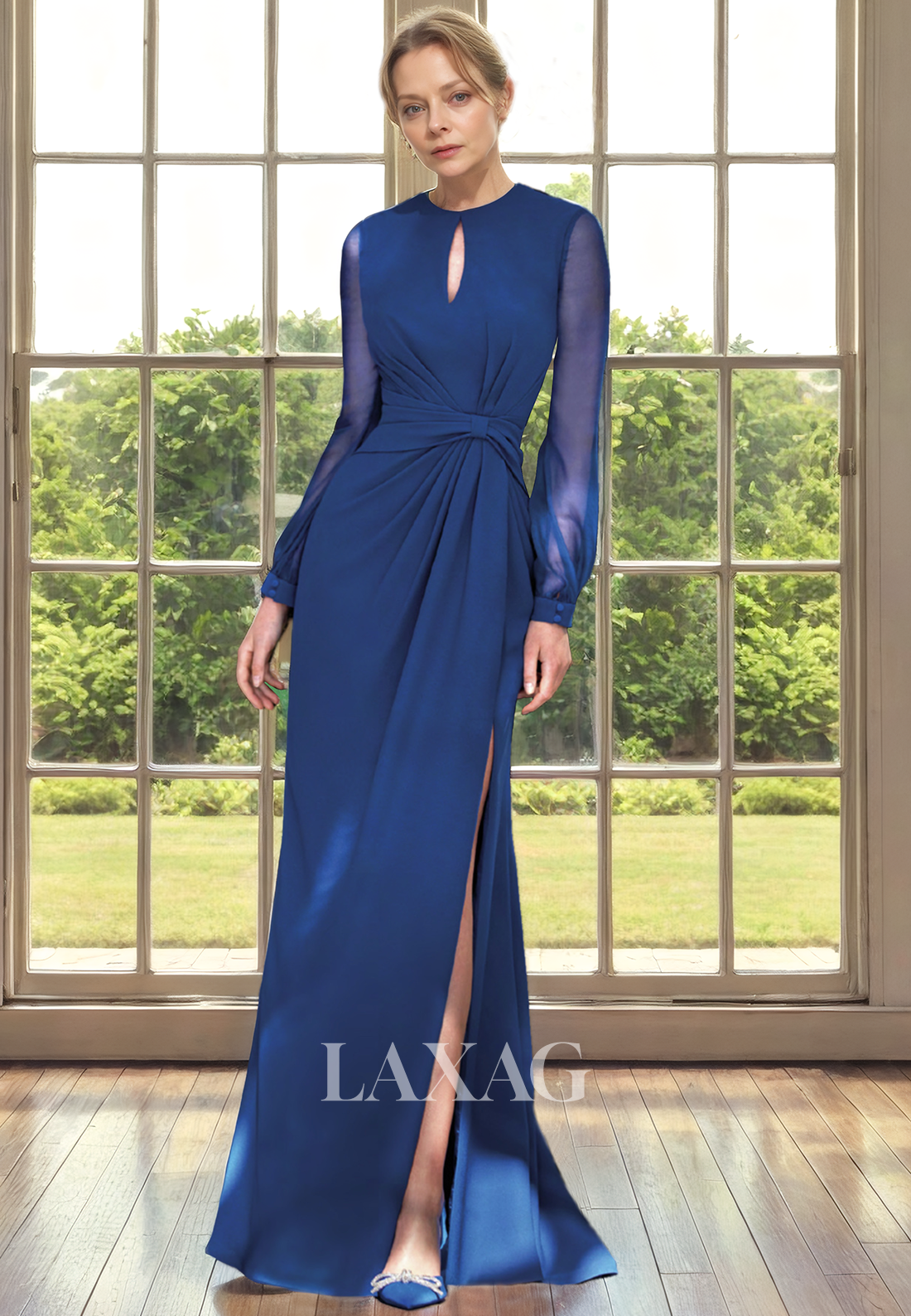 Round Long Sleeves Cutout Sleek Satin Mother of the Bride Dress with Slit