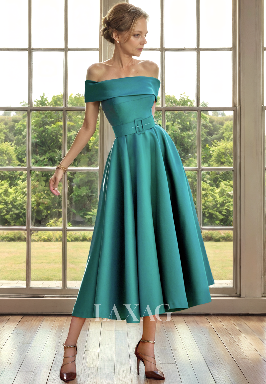 A-Line Off Shoulder Empire Belt Sleek Satin Elegant Mother of the Bride Dress
