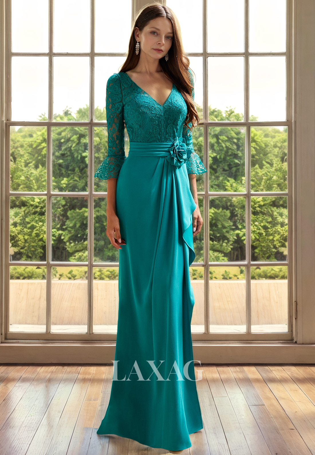 V-Neck Quarter Sleeves Lace Appliques Sleek Satin Mother of the Bride Dress