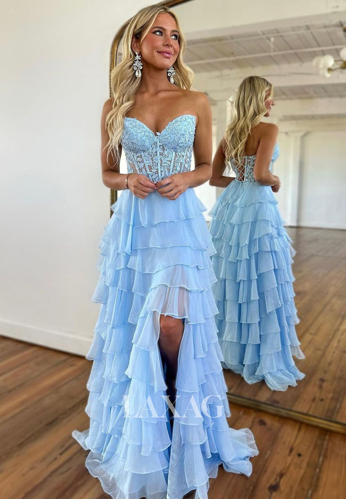This stunning formal gown features a sweetheart neckline, off-shoulder design, and beaded applique for a touch of elegance. The pleated and tiered chiffon fabric creates a fitted silhouette, perfect for prom or any special occasion. Elevate your look with this chic and sophisticated dress.