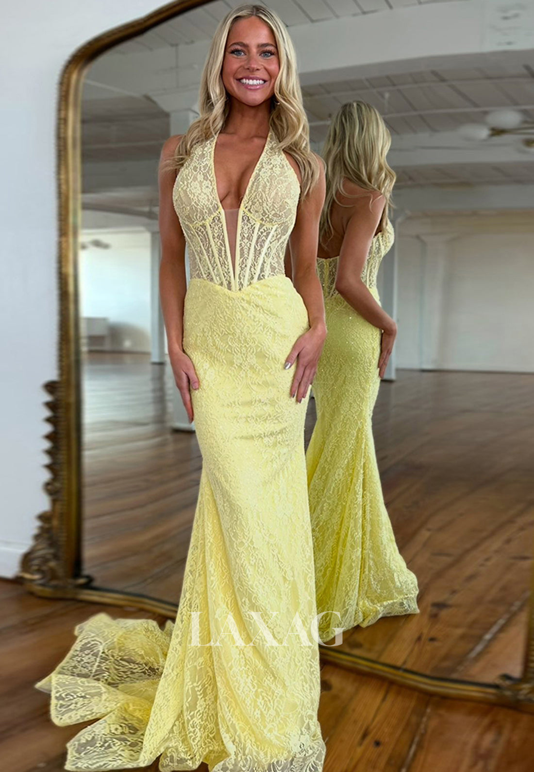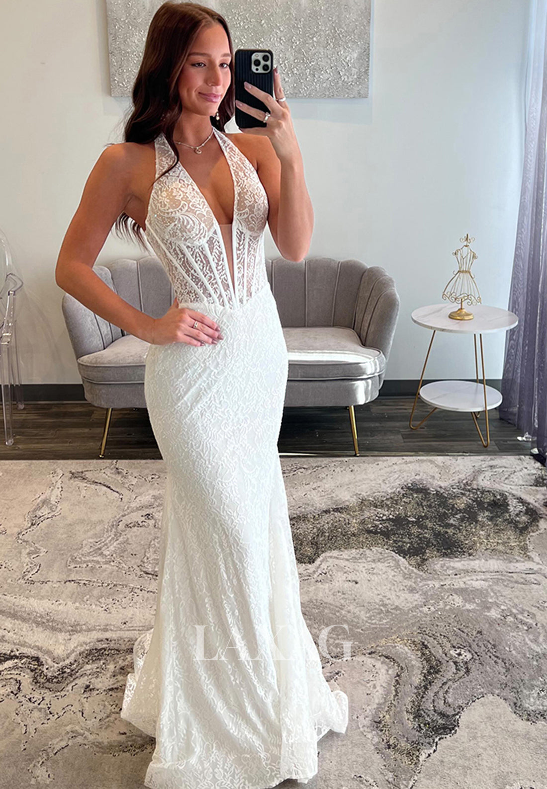 Halter Deep V-Neck Off-Shoulder Sleeveless Evening Gowns Allover Lace Applique Pleated Mermaid Prom Dress