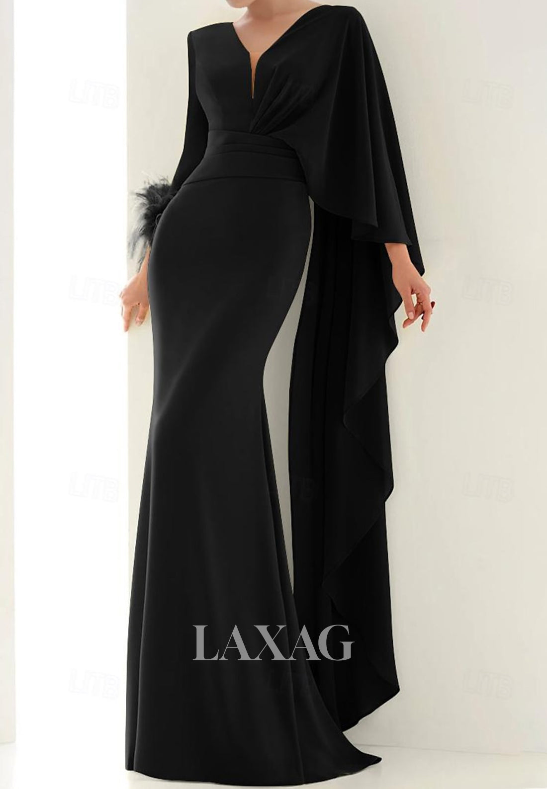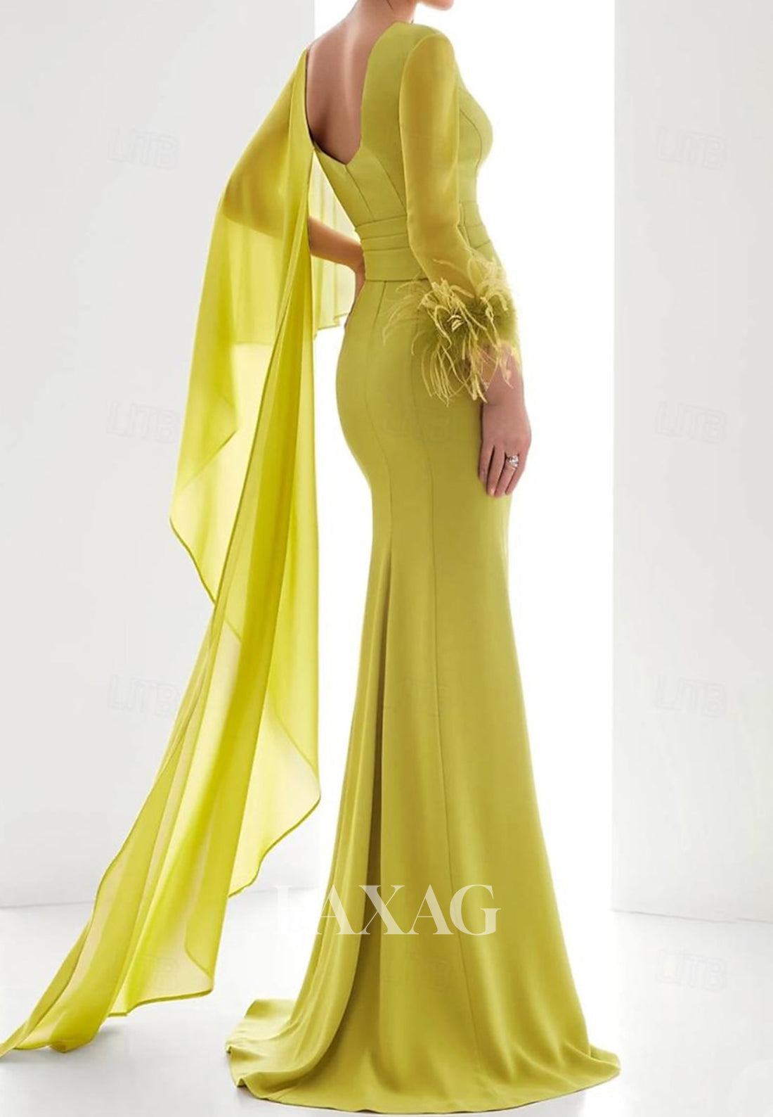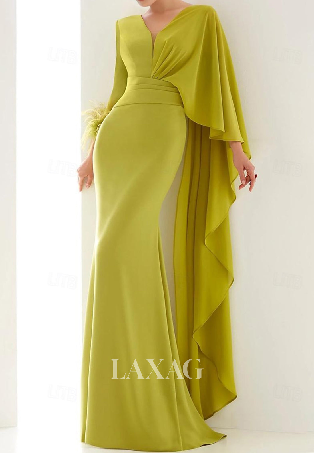 V-Neck Long Sleeves Floor-Length Mermaid Wedding Guest Dress Pleated Chiffon Sweep Train Evening Gowns