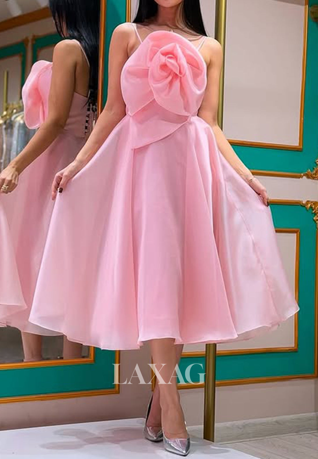 This spaghetti straps off-shoulder sleeveless A-line prom dress boasts a beautiful floral embellishment and pleated midi length, perfect for a formal occasion. With its elegant design and comfortable fit, you'll feel confident and stylish all night long.