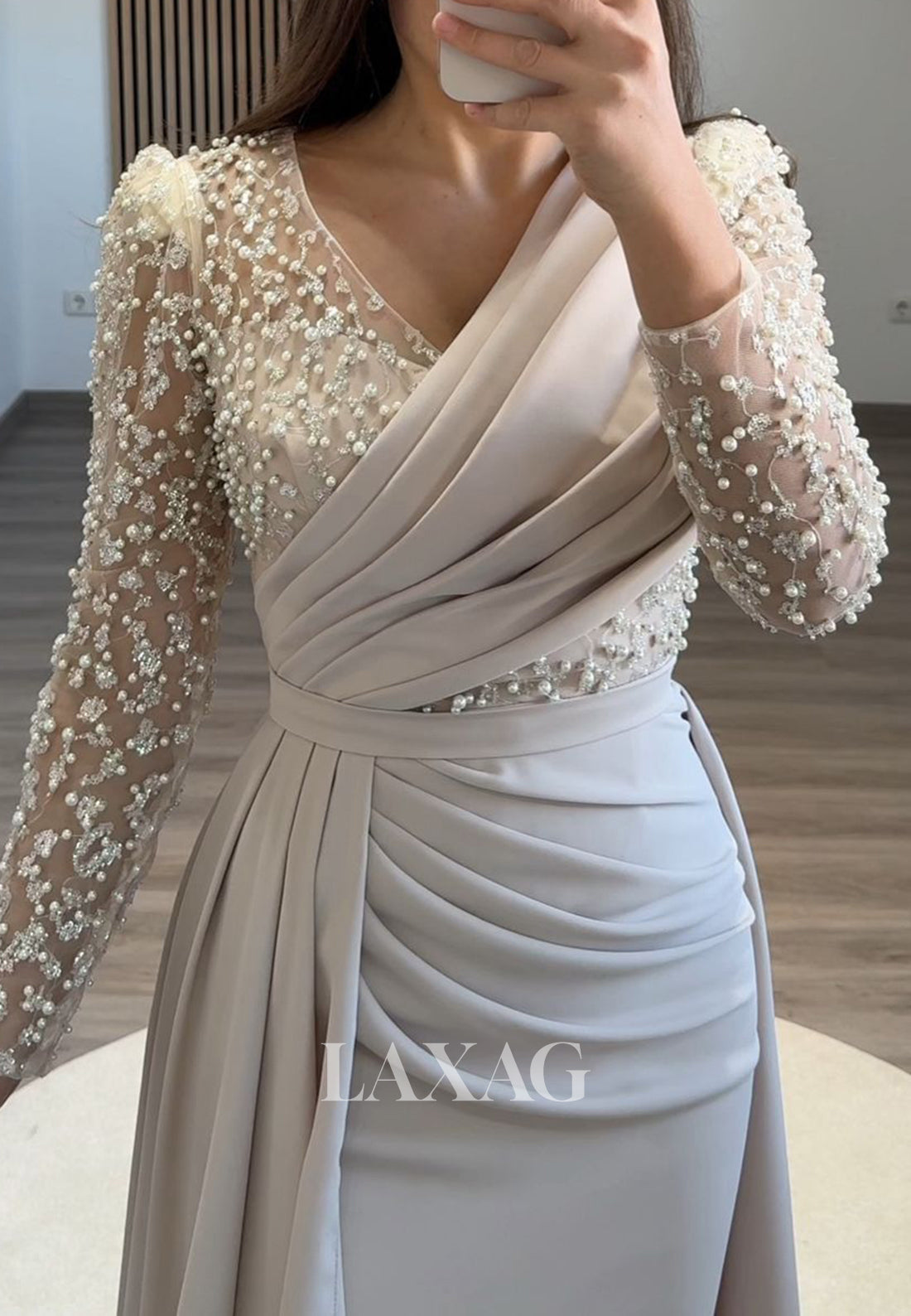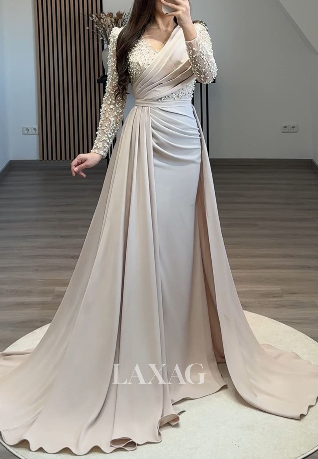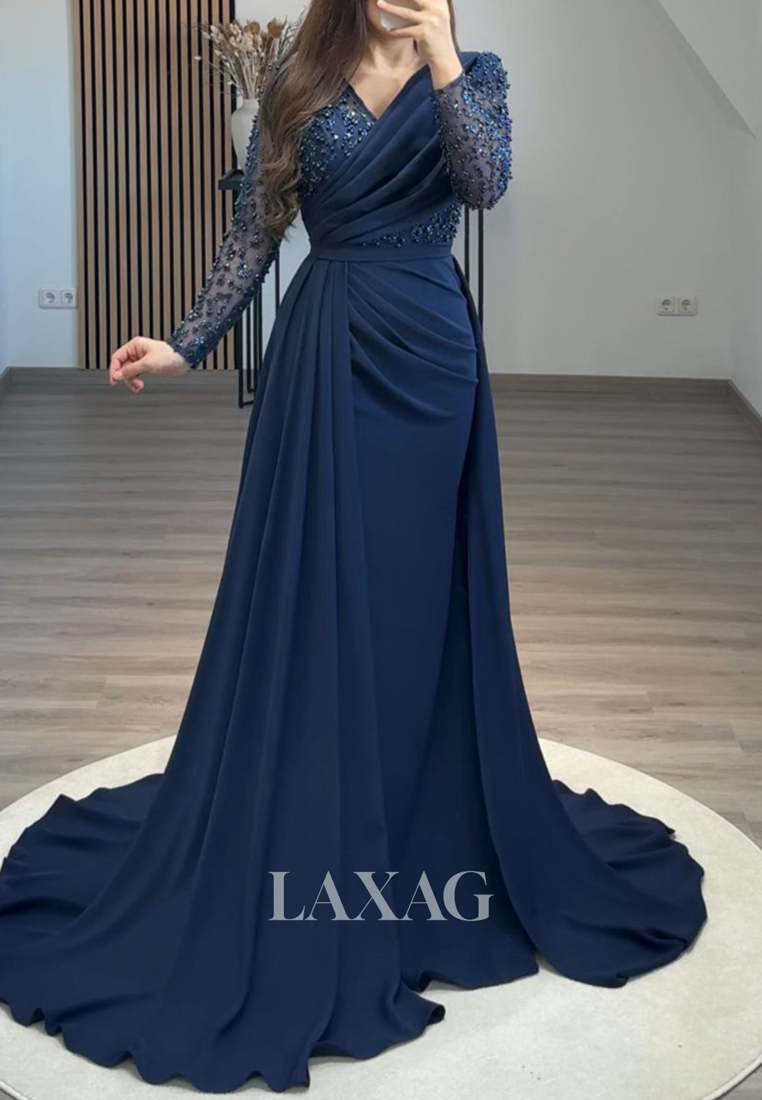 V-Neck Long Sleeves Mermaid Prom Dress Beaded Pleated Chiffon Formal Fowns with Overskirt