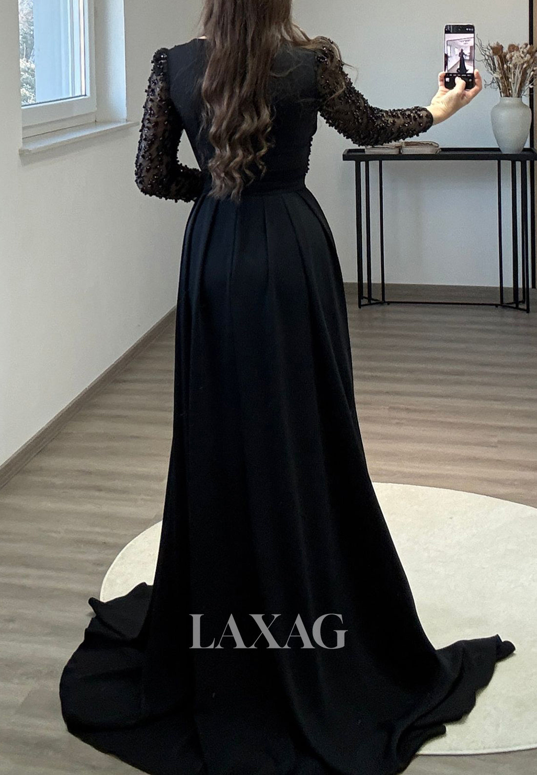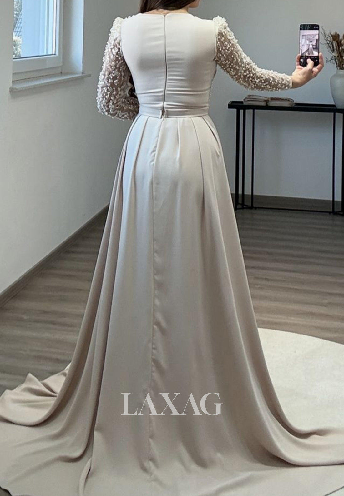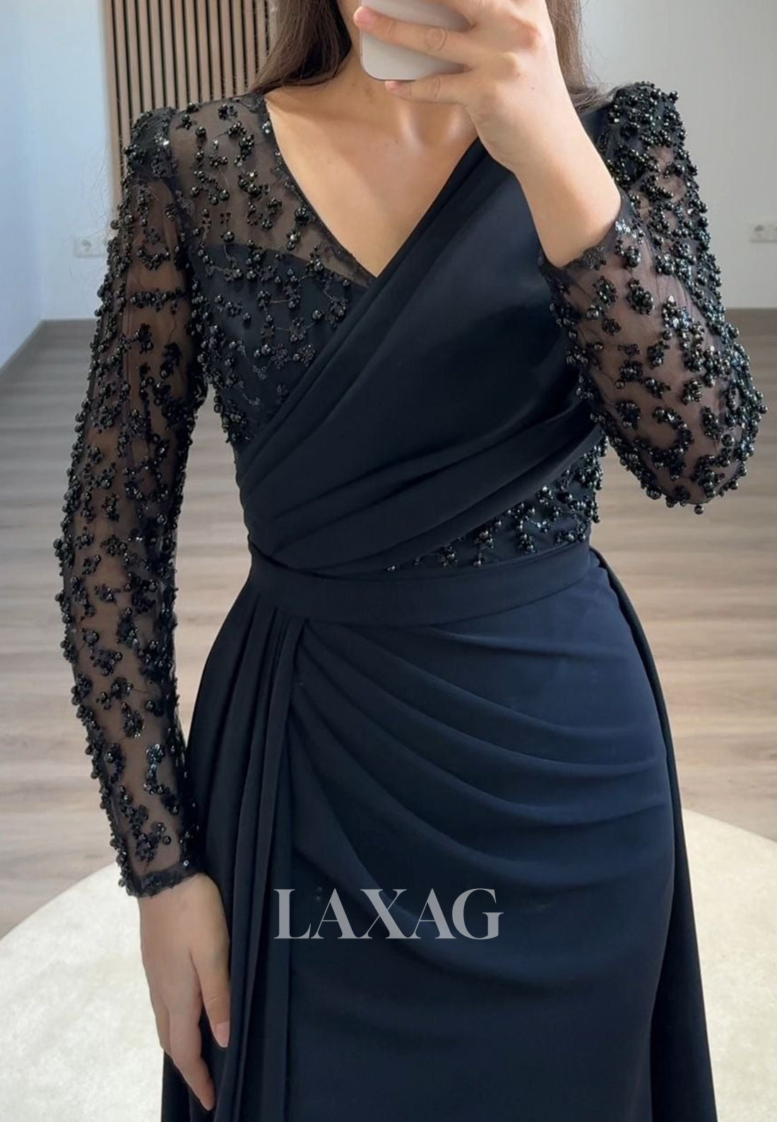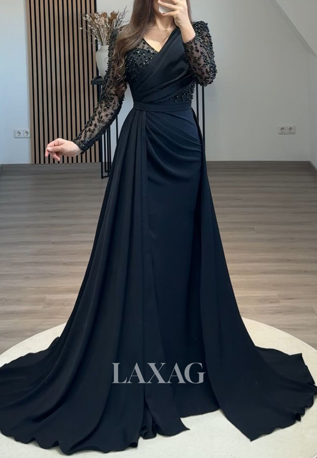 V-Neck Long Sleeves Mermaid Prom Dress Beaded Pleated Chiffon Formal Fowns with Overskirt