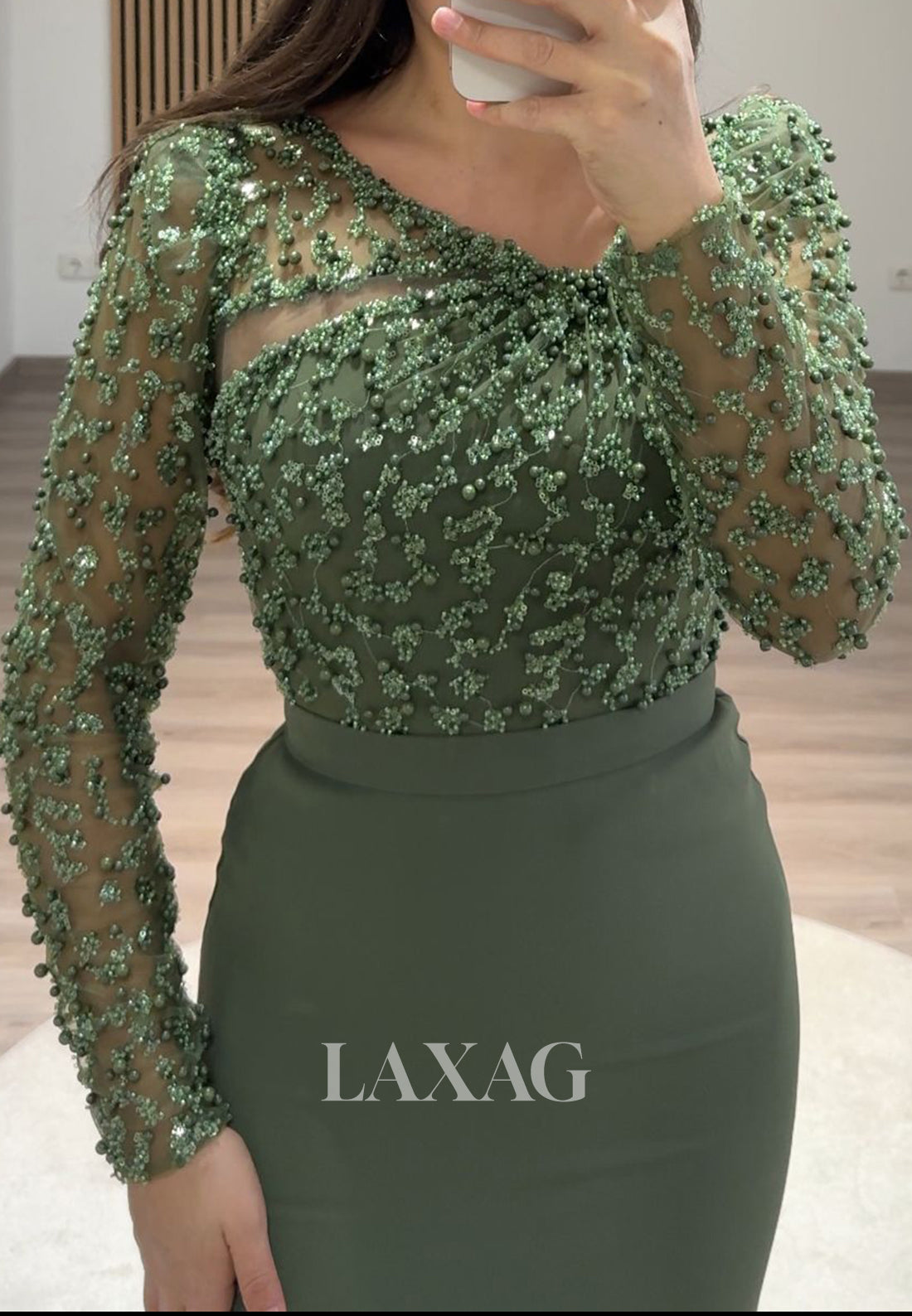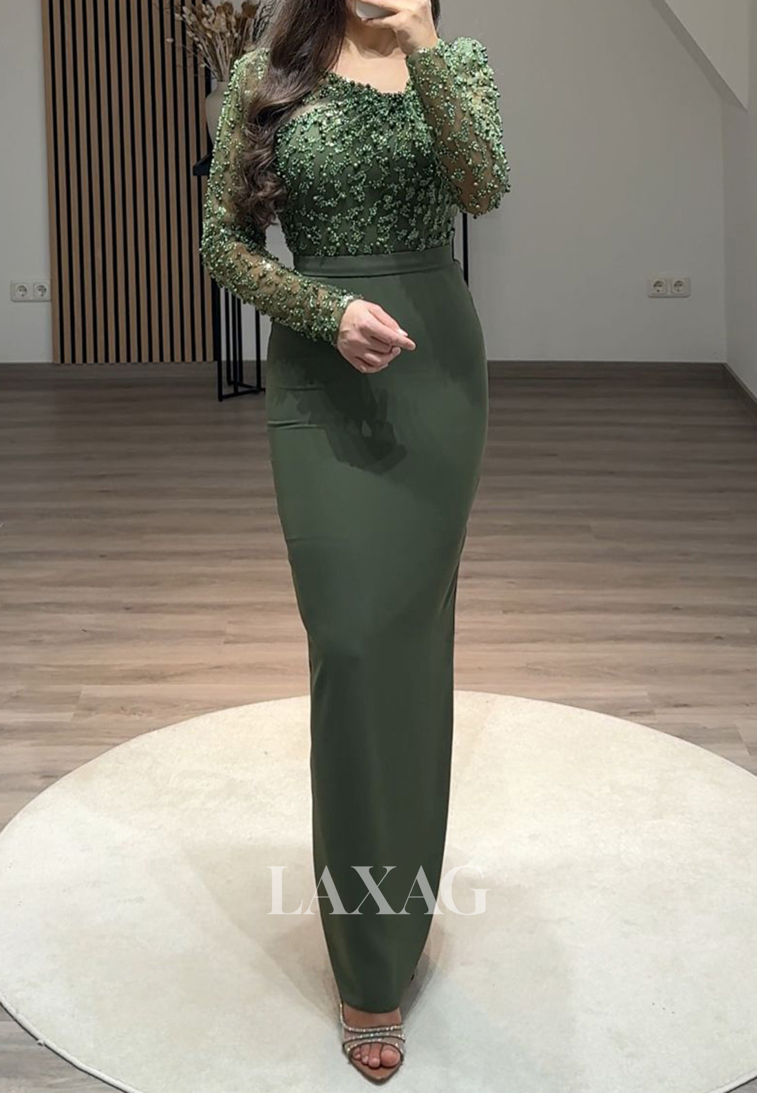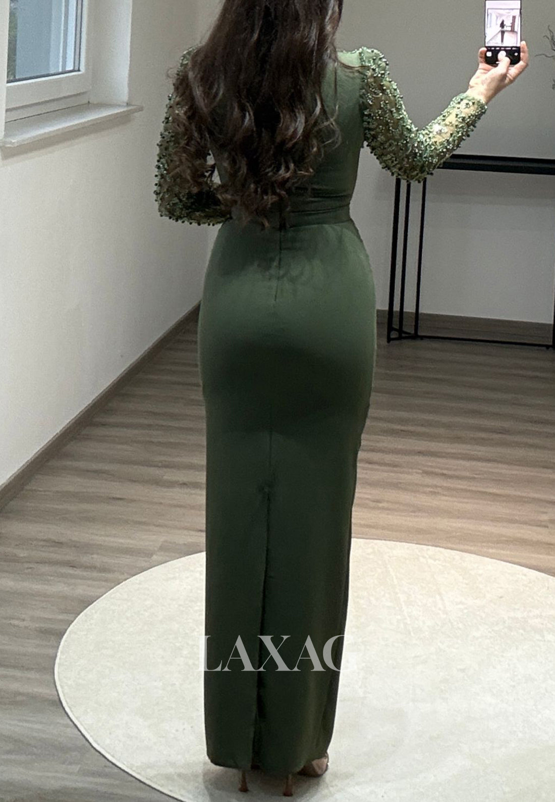 Scoop-Neck Beaded Sequined Floor-Length Party Gowns Long Sleeves Pleated Mermaid Prom Dress