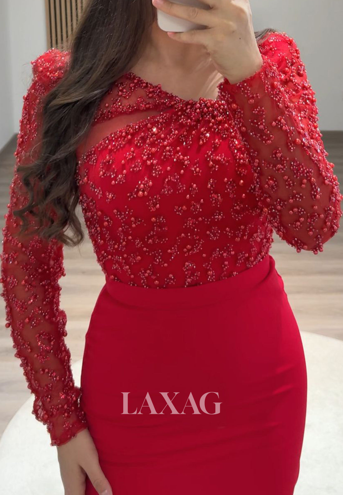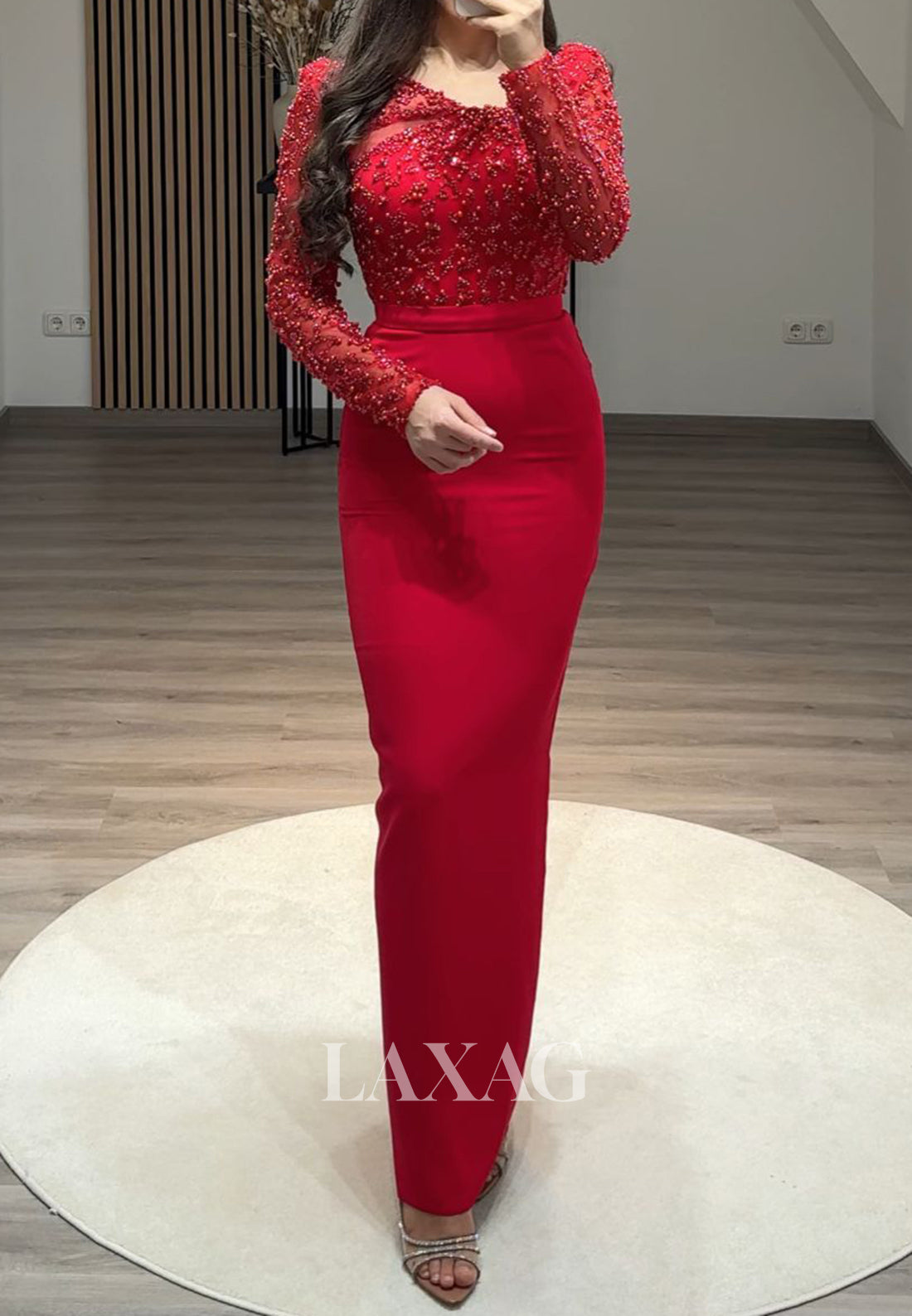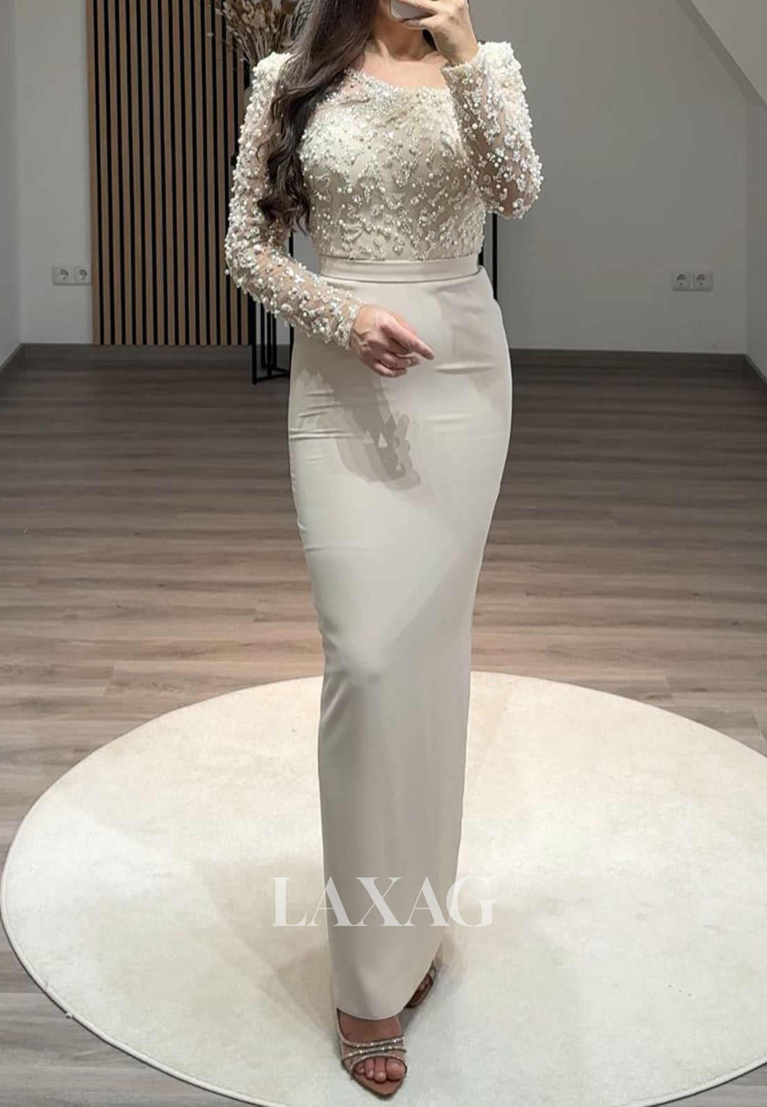 Scoop-Neck Beaded Sequined Floor-Length Party Gowns Long Sleeves Pleated Mermaid Prom Dress