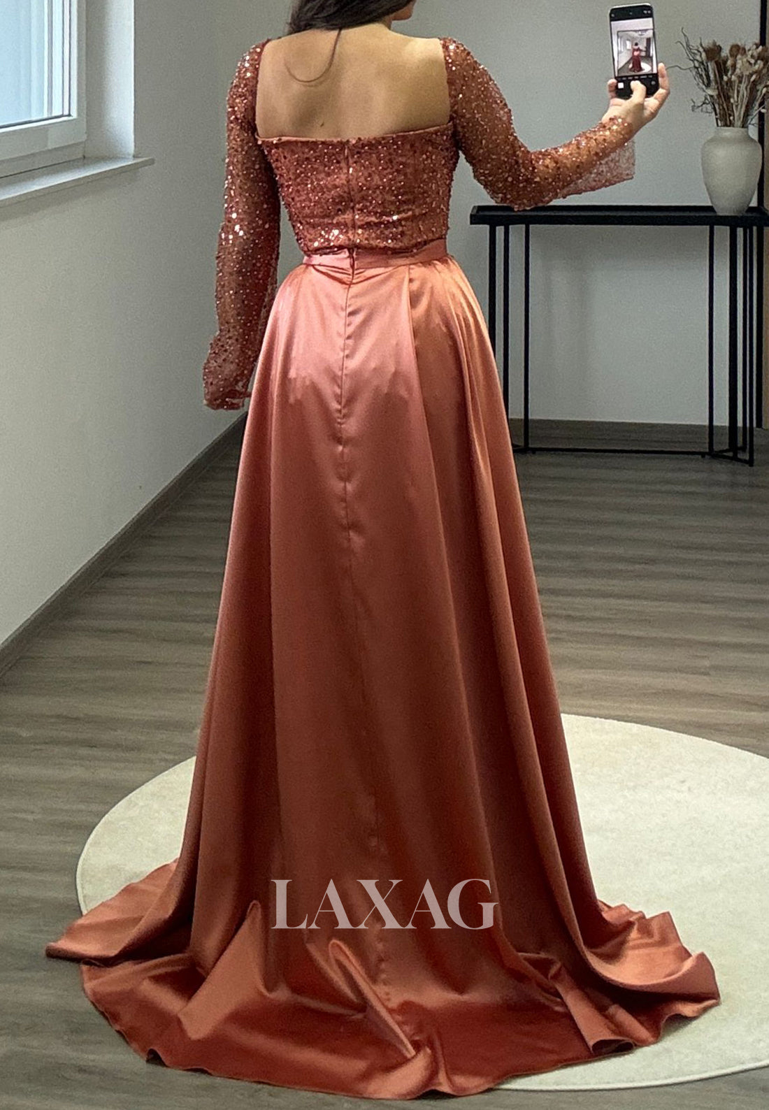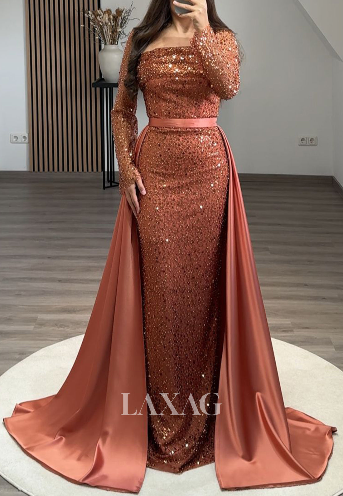 Fully Sequined Beaded Pleated Mermaid Prom Dress Square-Neck Long Sleeves Formal Gowns with Satin Overskirt