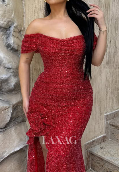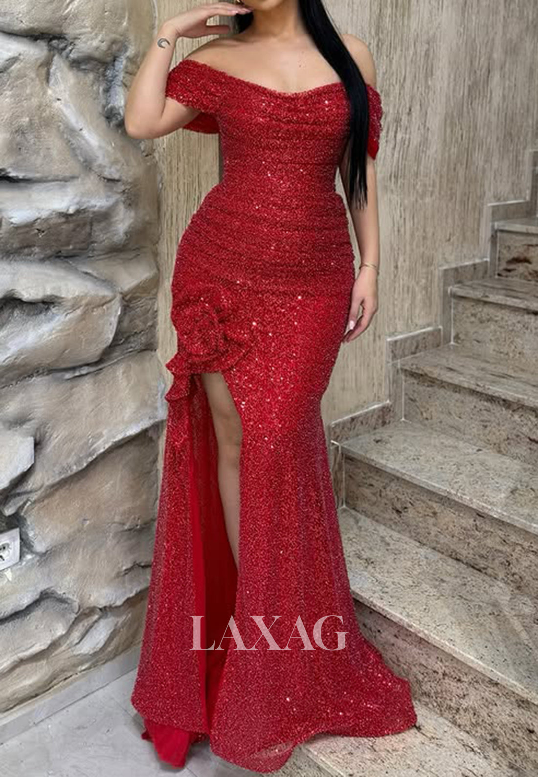 Scoop-Neck Off-Shoulder Sleeveless Fully Sequined Beaded Pleated Mermaid Prom Dress with High Slit
