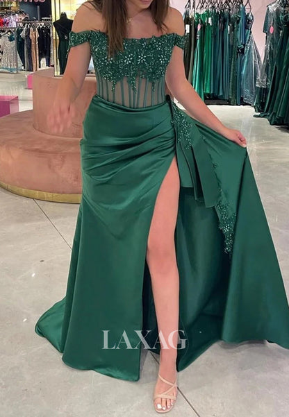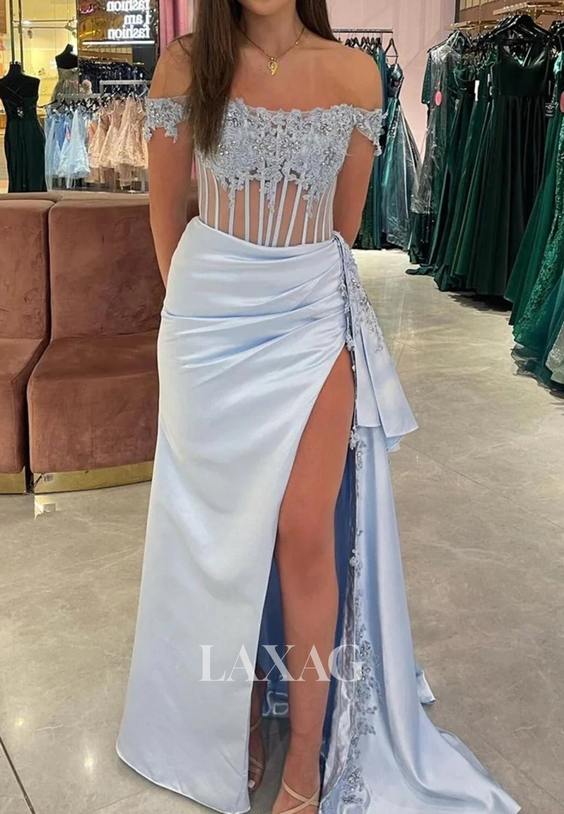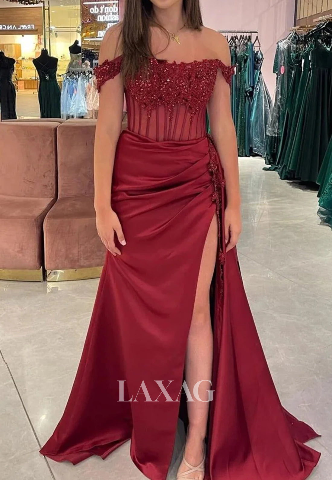 Boat-Neck Off-Shoulder Sleeveless Mermaid Prom Dress Beaded Applique Pleated Party Gowns with High Slit