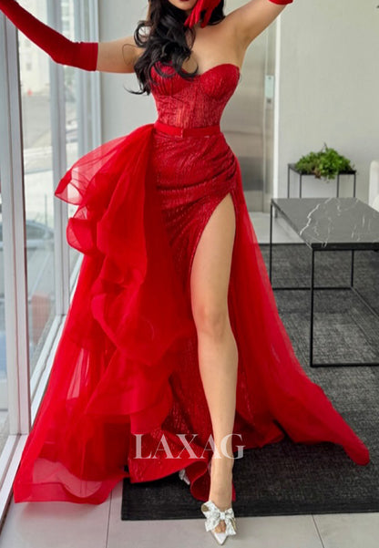 Off-Shoulder Sleeveless Sweetheart Allover Lace Pleated High Slit Mermaid Prom Dress with Long-Gloves
