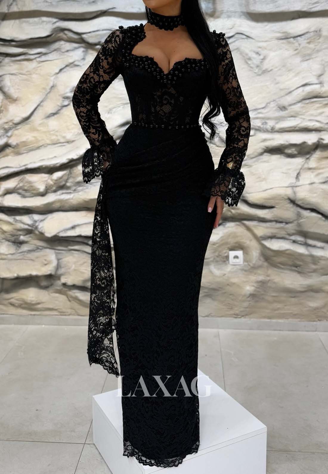 Sweetheart Long-Sleeves Pleated Mermaid Prom Dress Allover Lace Beaded Floor-Length Formal Gowns