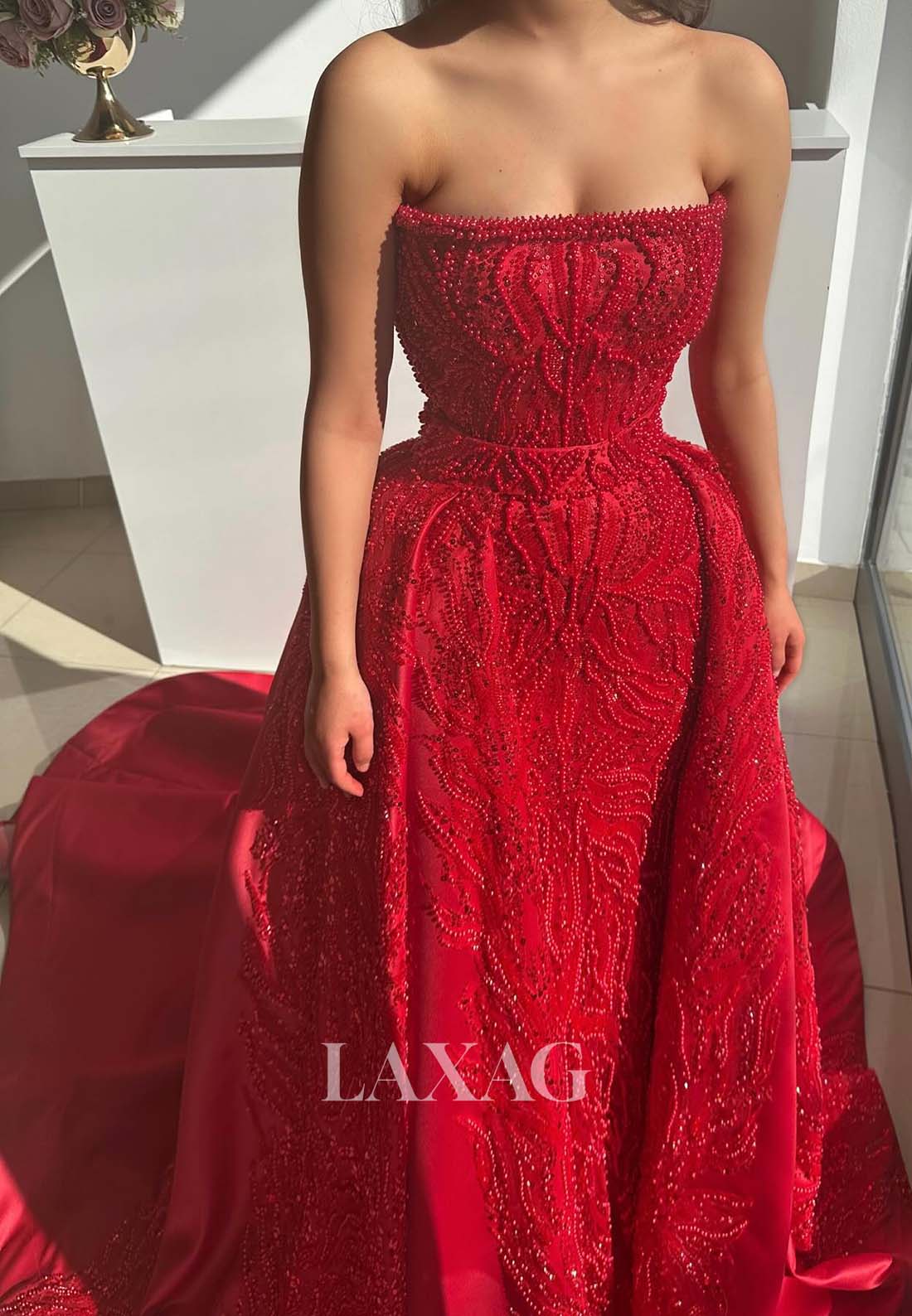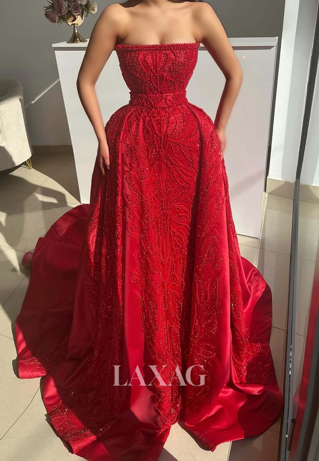Tube Top Sleeveless Fully Beaded A-Line Prom Dress Off-Shoulder Pleated Sweep Train Formal Gowns