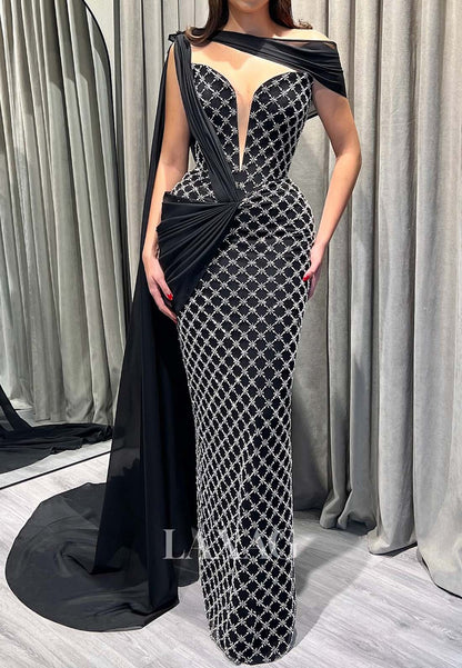 Plunging V-Neck Sleeveless Floor-Length Mermaid Formal Evening Gowns with Tulle Train