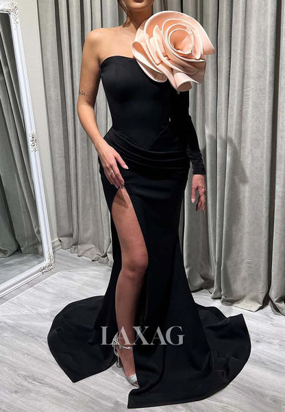 This stunning tube top formal gown boasts a big floral embellishment and a mermaid silhouette with a high slit. Perfect for any elegant evening event, this dress will make you feel confident and effortlessly chic. Turn heads and make a statement with this eye-catching gown.