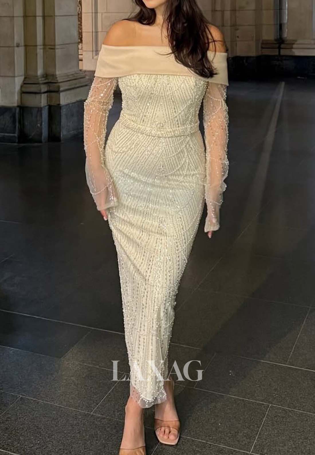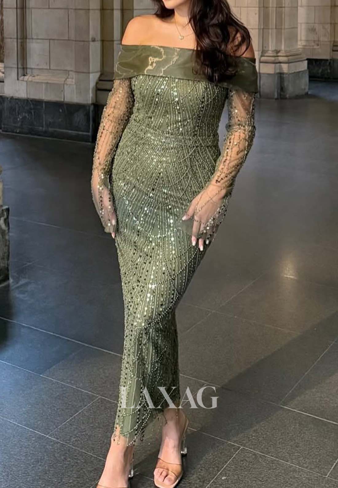 Tube Top Long-Sleeves Fully Beaded Evening Dress Off-Shoulder Pleated Ankle-Length Formal Gowns