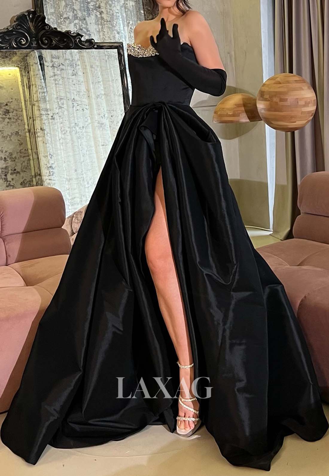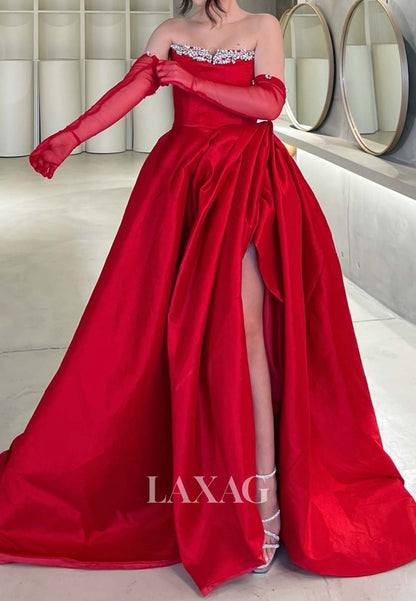 Beaded Tube Top Off-Shoulder Pleated Formal Gowns High Slit A-Line Evening Dress with Gloves