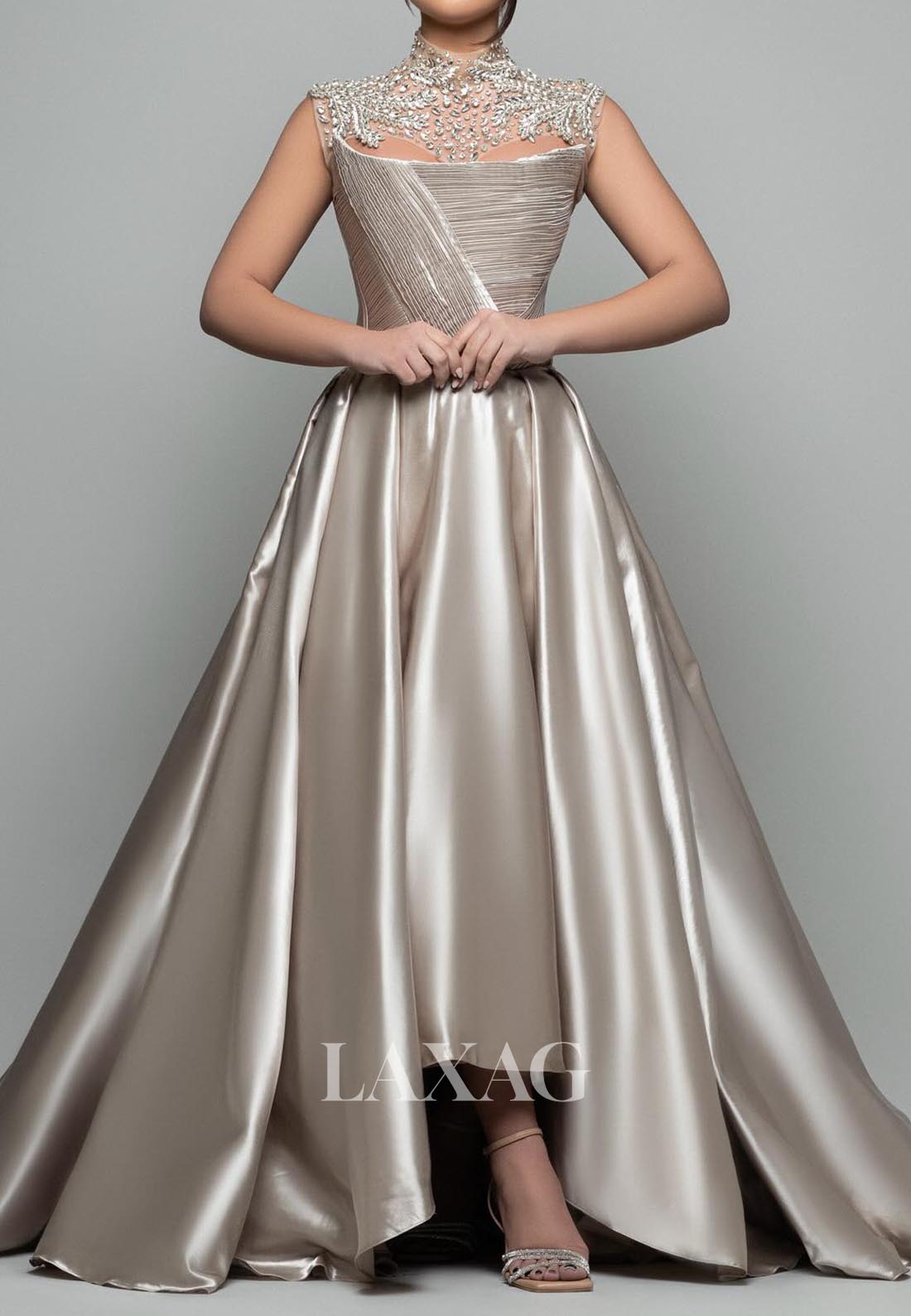 High-Neck Sleeveless Sheer A-Line Evening Dress Beaded Pleated Satin Formal Gowns
