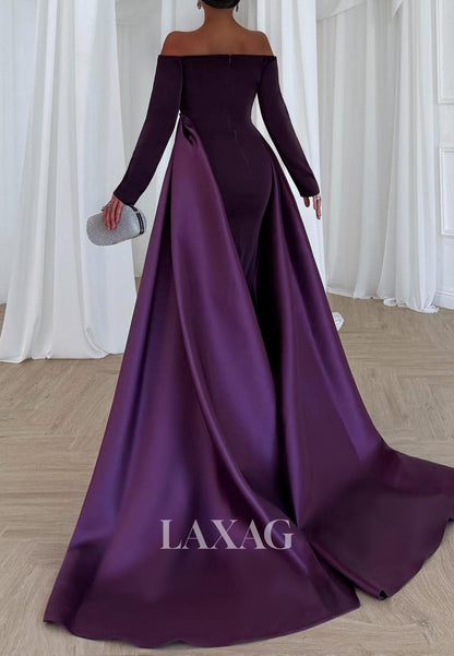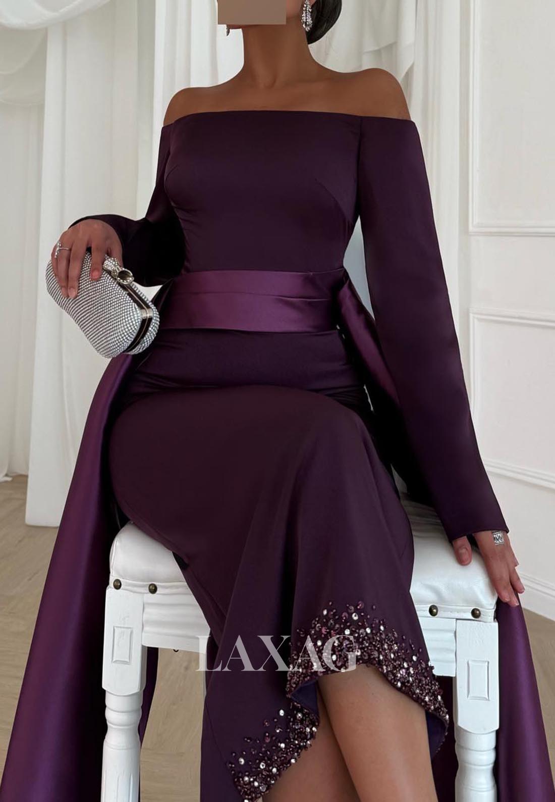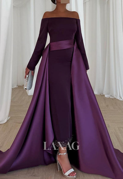 Simple Off-Shoulder Long-Sleeves Beaded Satin Ankle-Length Mermaid Evening Dress with Overlay