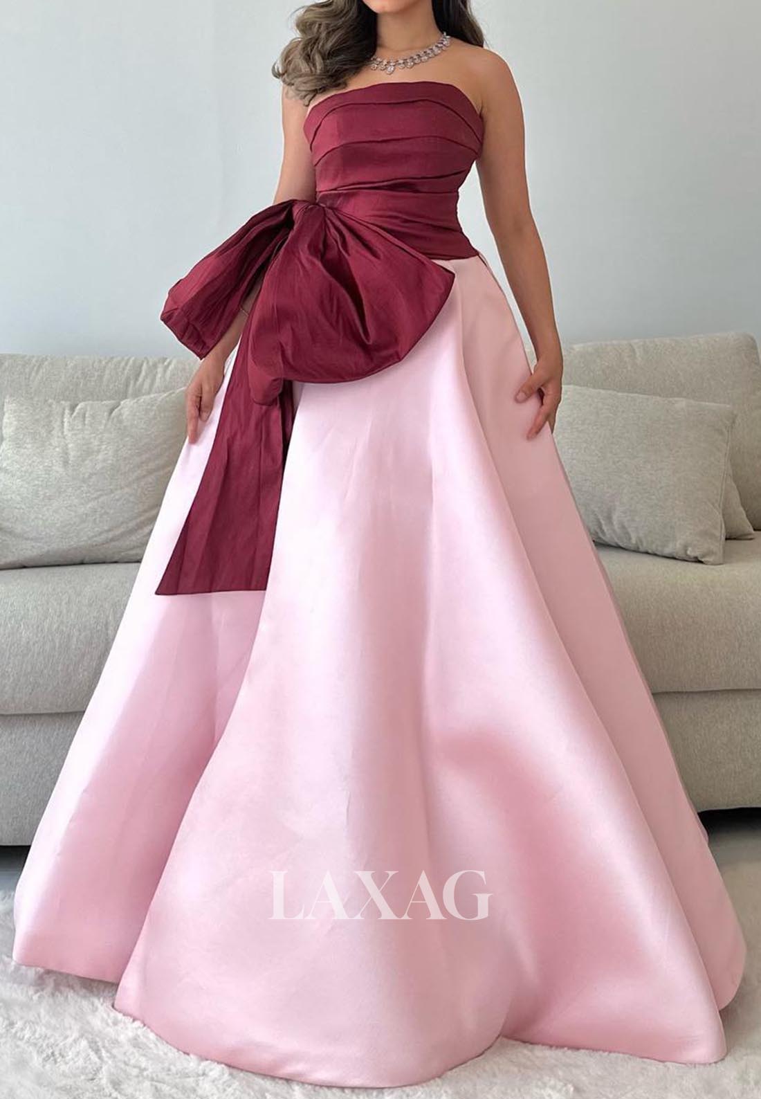 Sleeveless Off-Shoulder Pleated Satin Formal Gowns Tube Top Two Tone A-Line Evening Dress with Bows