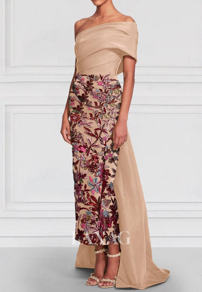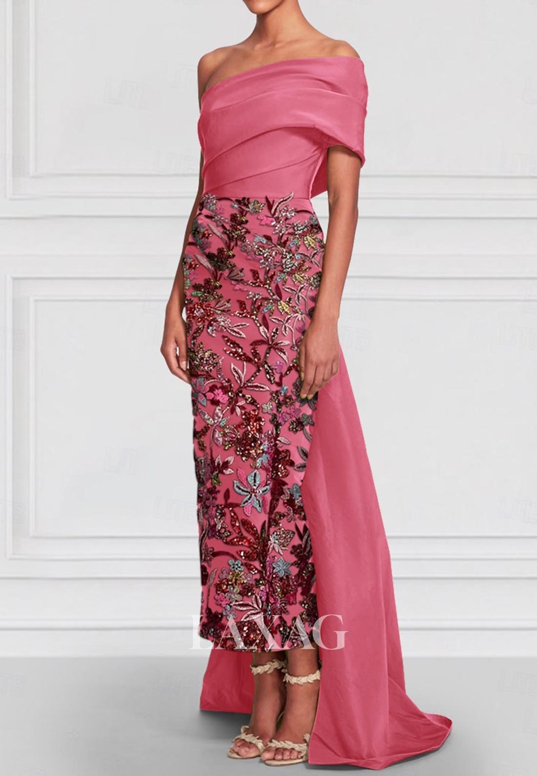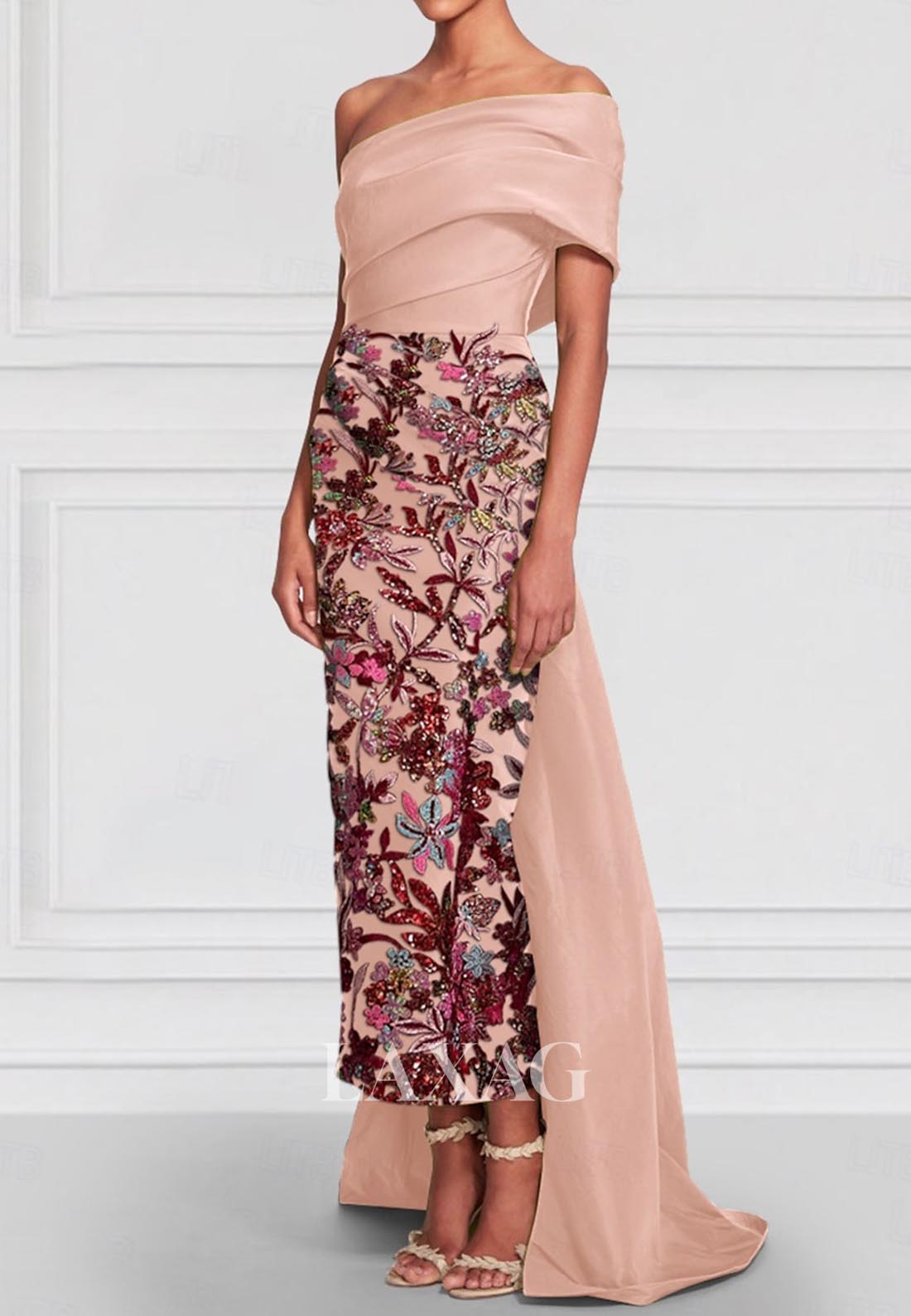 Asymmetrical-Neck Ankle-Length Mermaid Evening Gowns Floral Embroidered Sequined Formal Gowns