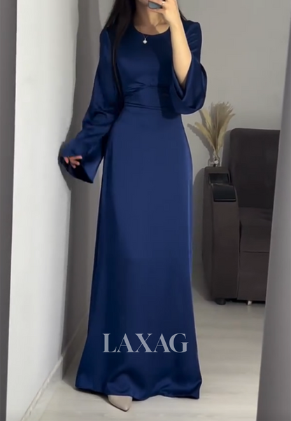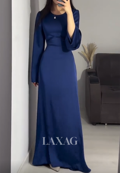 Scoop-Neck Long-Sleeves Pleated Sarin Fitted Floor-Length Evening Gowns