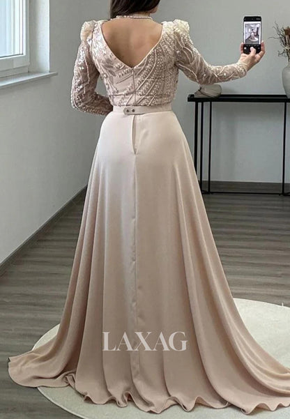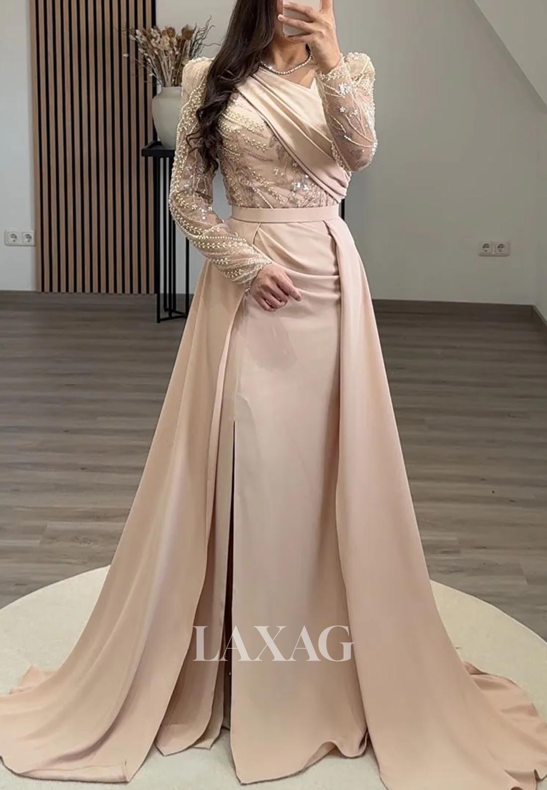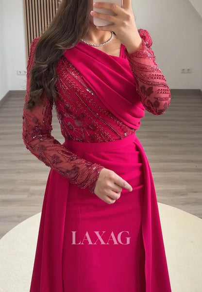Asymmetrical-Neck Long-Sleeves Mermaid Evening Dress Beaded Pleated Satin Formal Gowns with Train